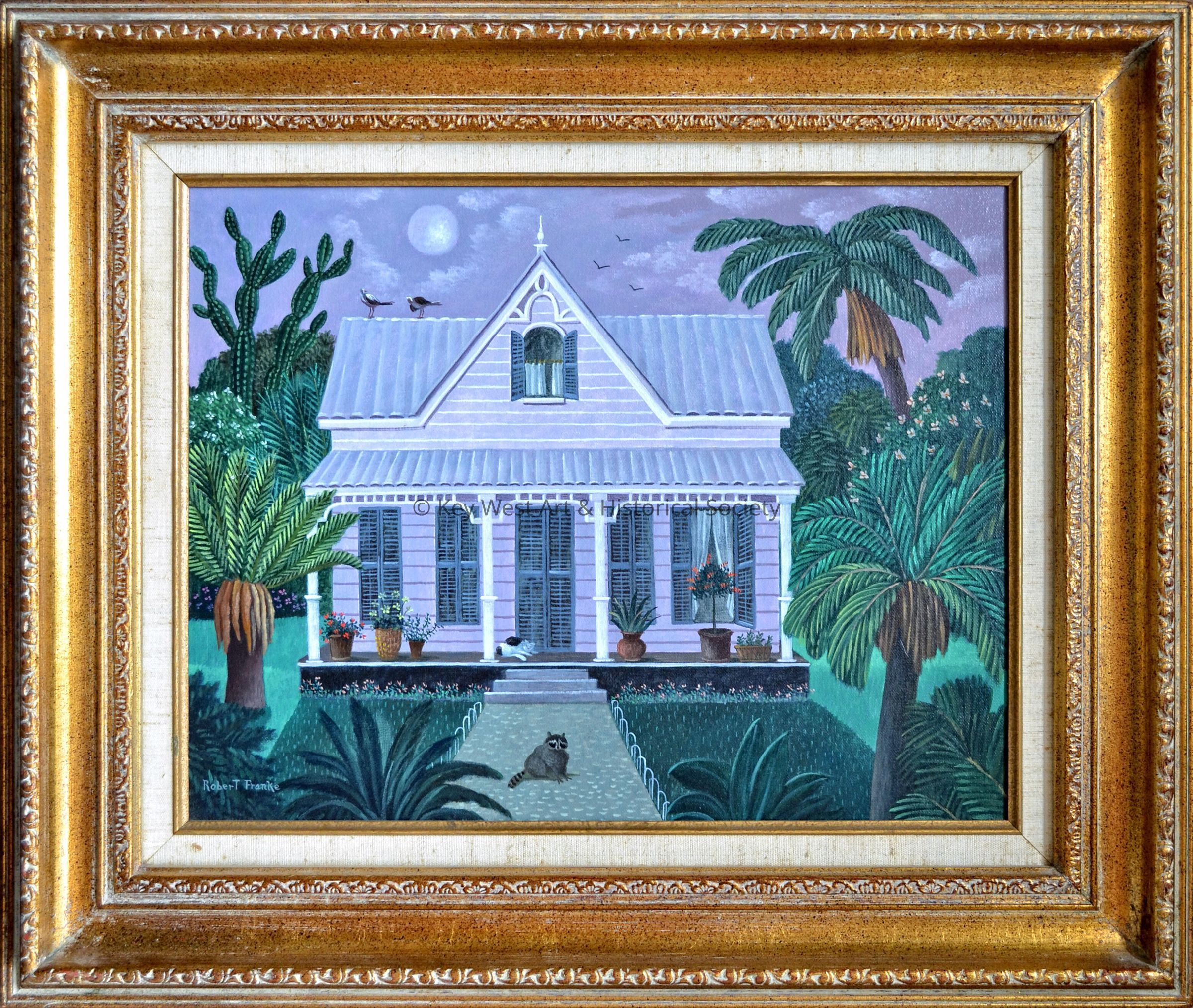 Oil painting on canvas by Robert Franke depicting a Key West house at night.  A raccoon is located on the front path while a cat sleeps on the front porch.Artwork Details