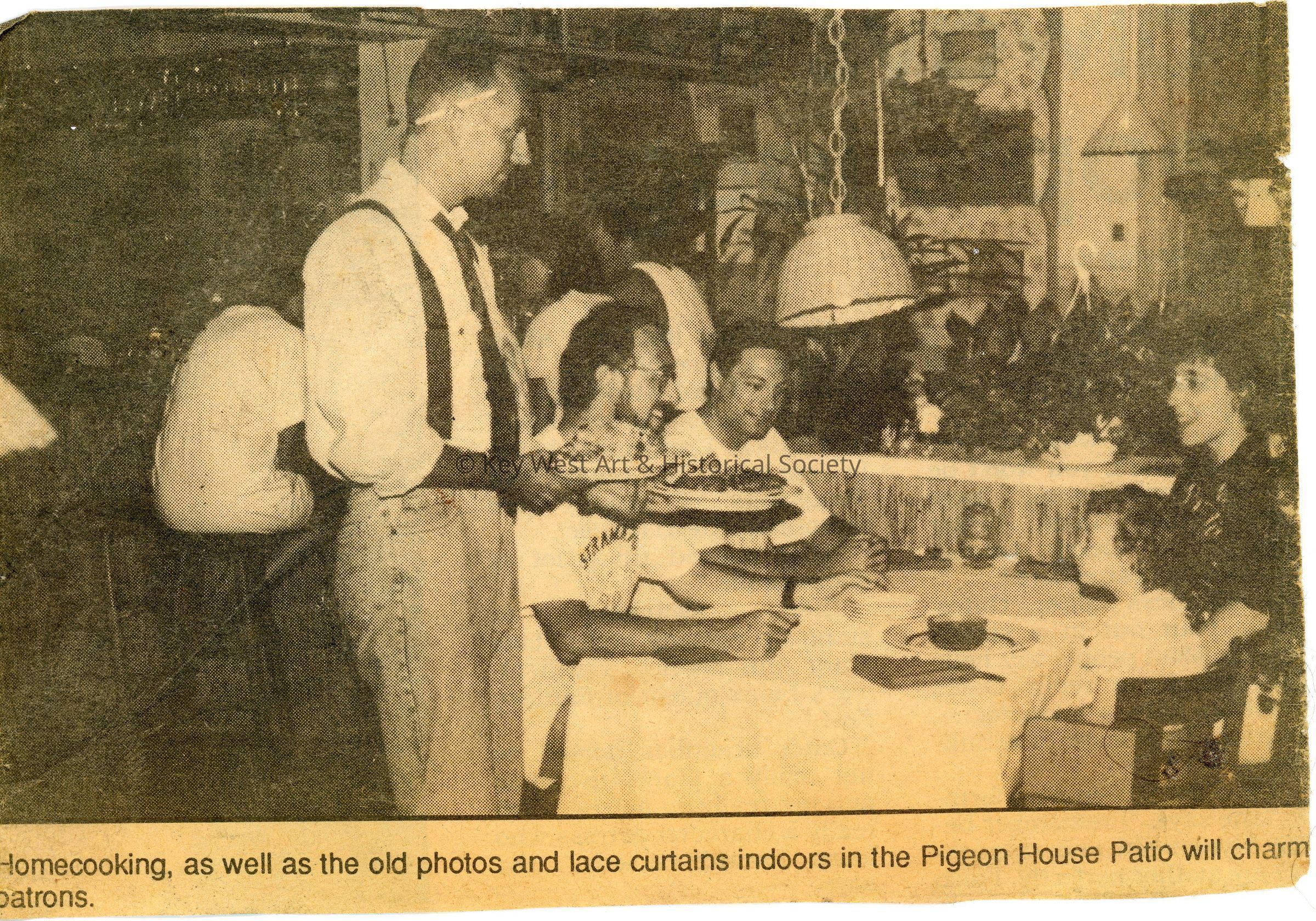 Newspaper clipping of a photo taken inside Pigeon House Patio of a server waiting on diners. Pigeon House was once located at 301 Whitehead Street.