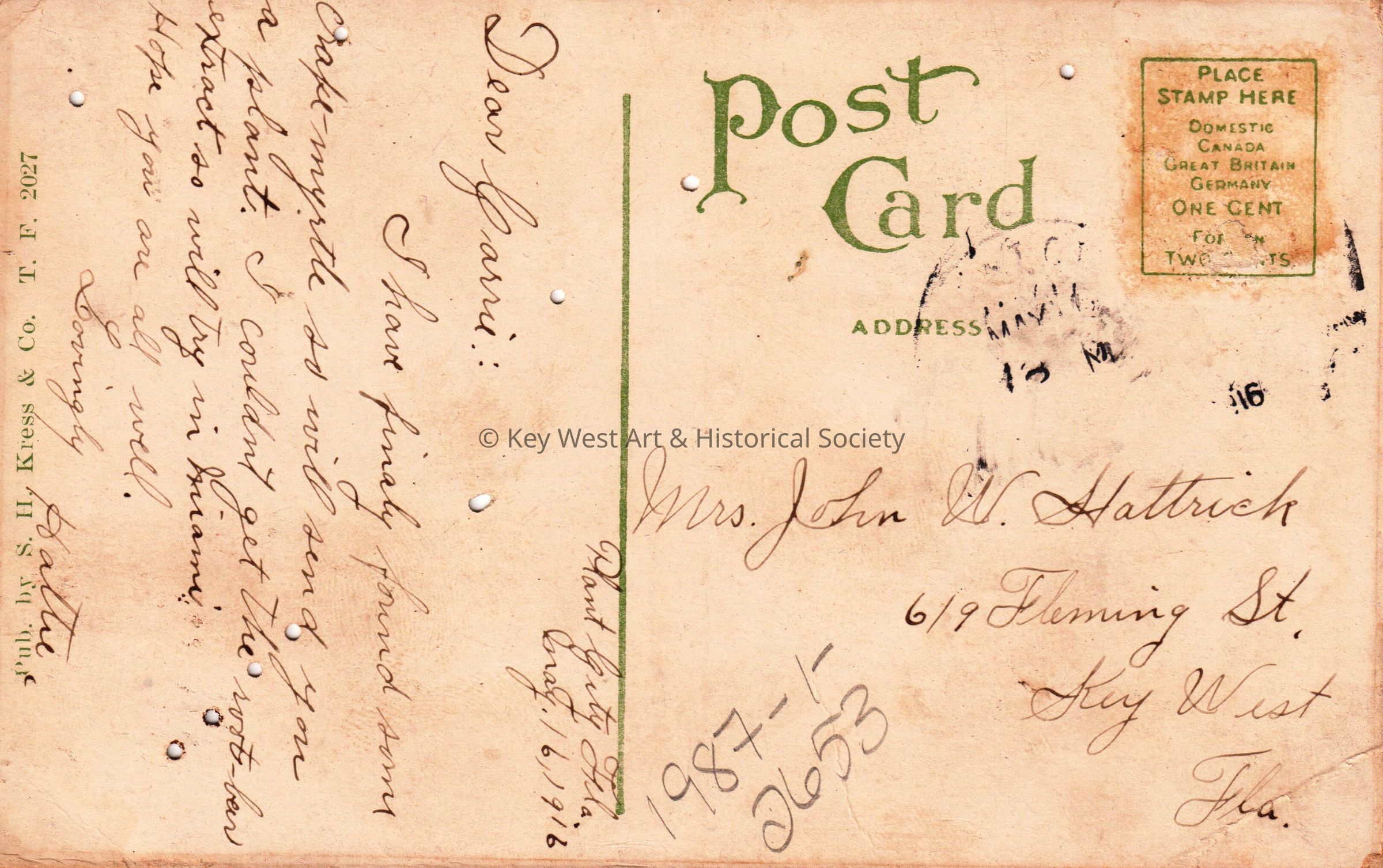 Postcard depicting the Confederate Monument in Tampa, Florida.  The caption reads, ‘Confederate Monument, Tampa, Florida’.  The message on the verso reads, ‘Plant City, Florida, May 16, 1916, Dear Carrie, I have finally found some crape-myrtle so will send you a plant.  I couldn’t get the root beer extract, so will try in Miami.  Hope you are all well.  Lovingly, Hattie’.  The card is addressed to Mrs. John W. Hattrick, 619 Fleming Street, Key West, Florida, and is postmarked Plant City, Florida, May 16, 1916.Collection