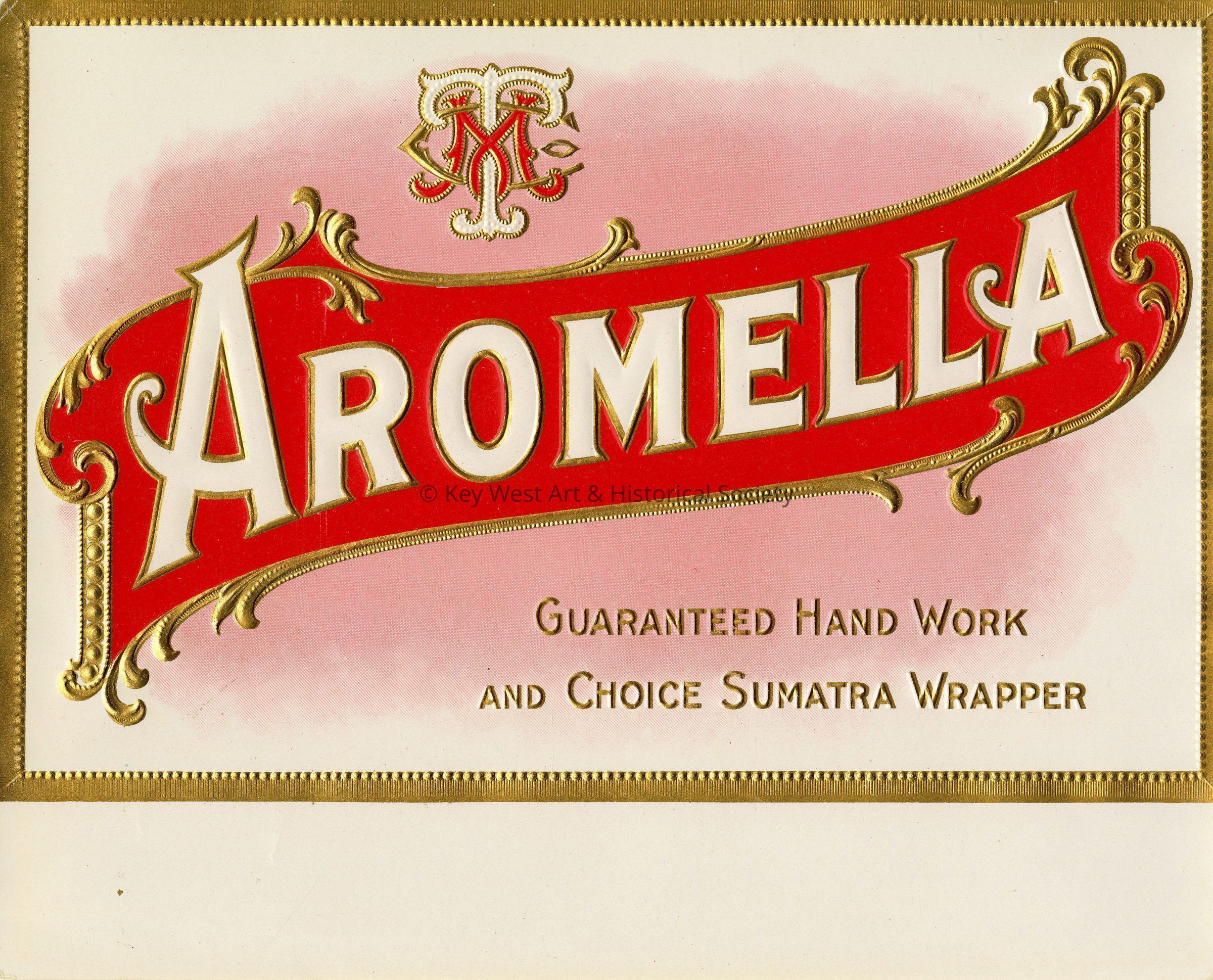 Full color lithograph inner box cigar label promoting Aromella cigars. Likely taken from a sample book produced by the lithographer. Caption on label reads, 'Guaranteed Hand Work and Choice Sumatra Wrapper'.Type of Print