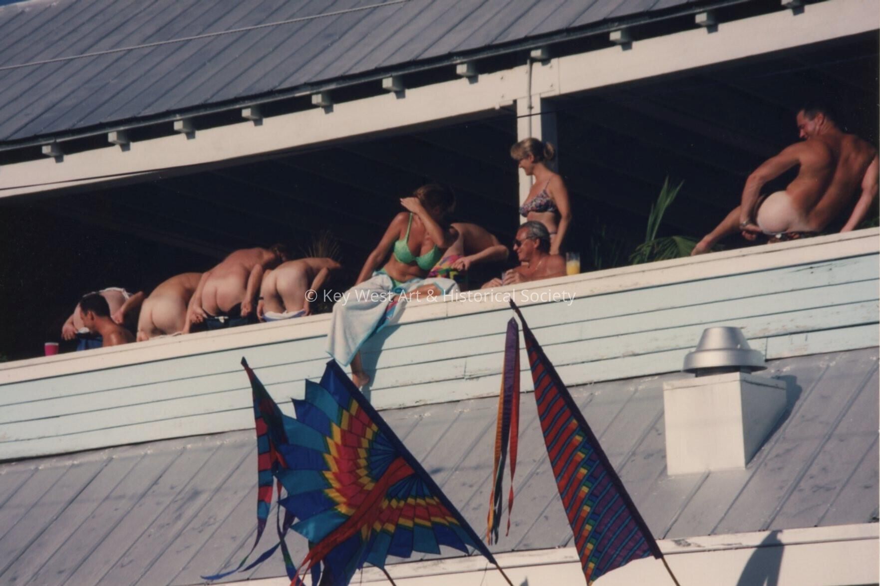 Unknown people on a balcony, men are mooning the crowd below.Entry/Object ID