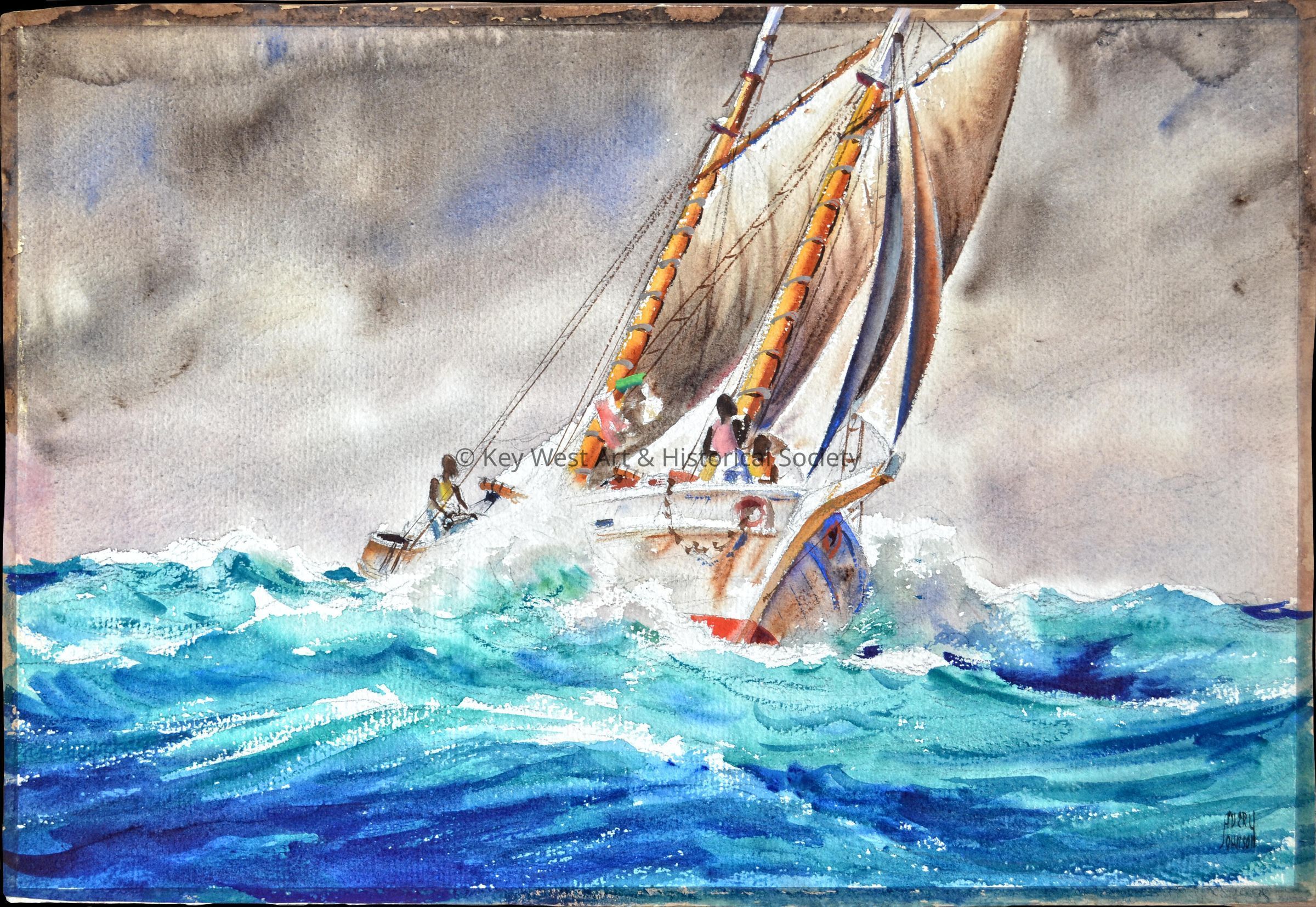 Watercolor painting by Avery Johnson depicting a two-masted ship sailing in a stormy sea.  The vessel is sailed by three black crew members.Artwork Details