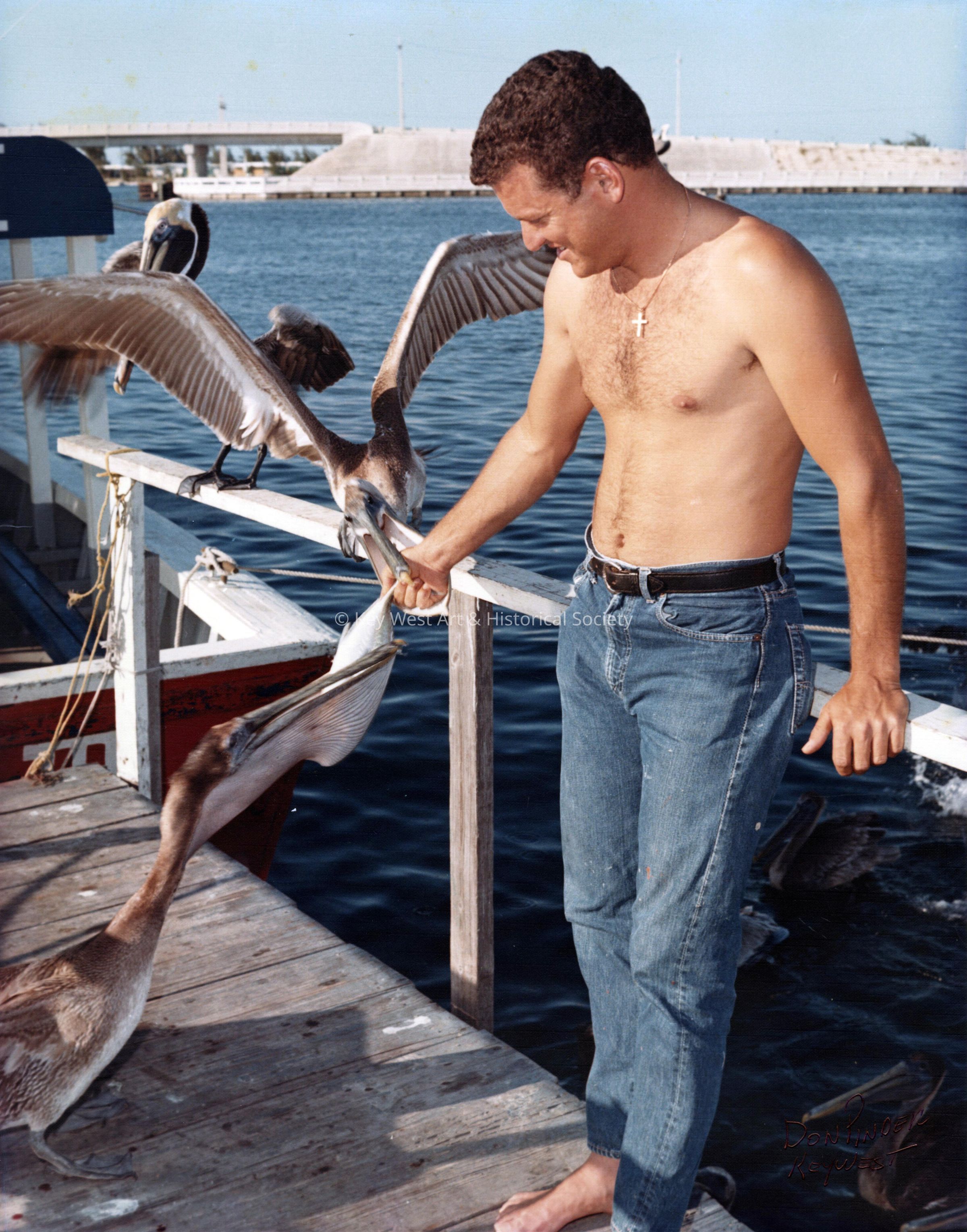 Color photograph taken by Don Pinder of an unknown man feeding pelicans at Garrison Bight.