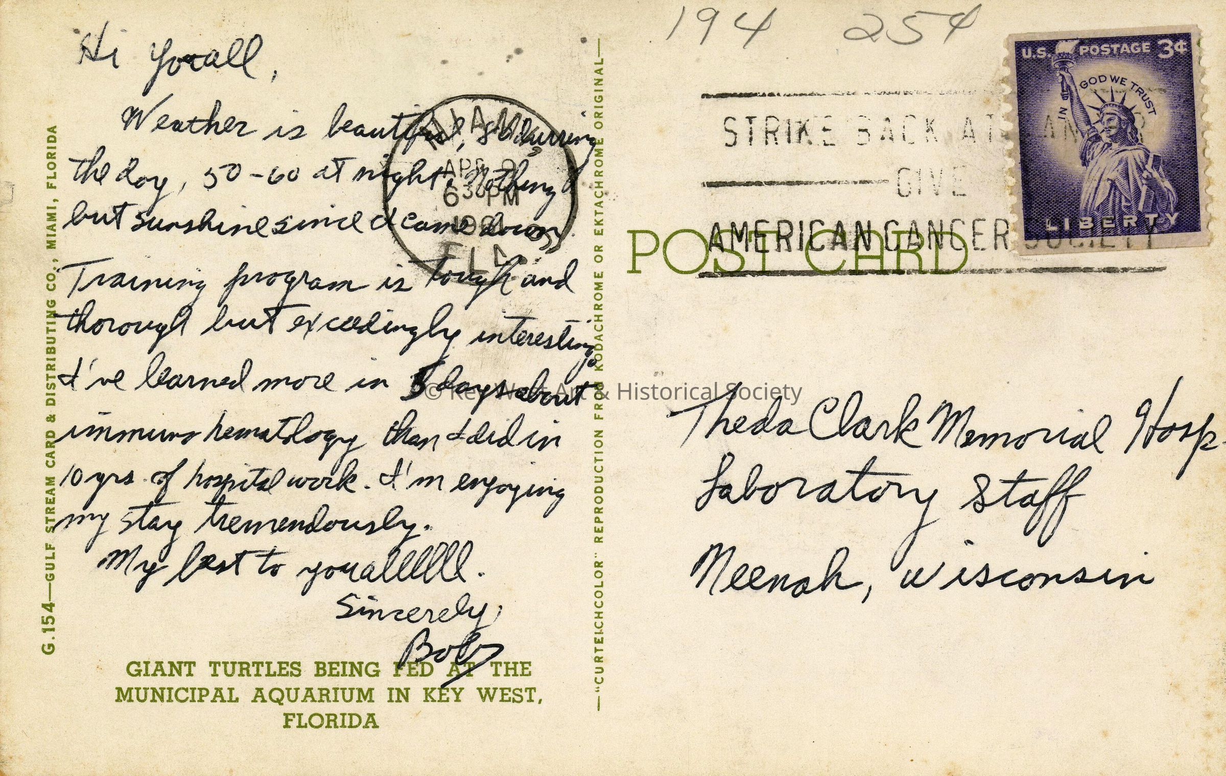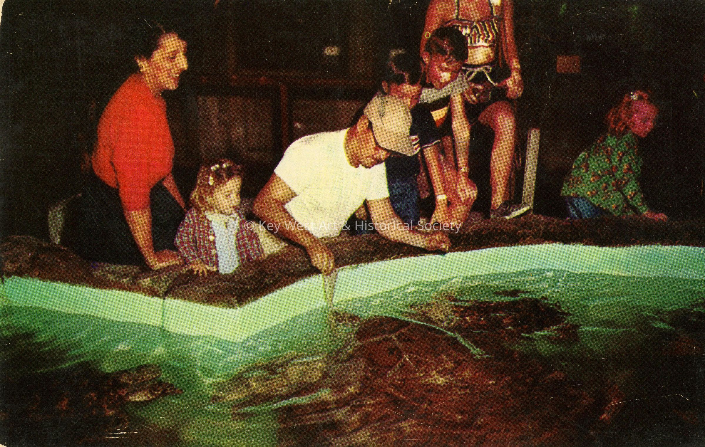 Postcard of visitors feeding turtles at the Key West Aquarium. Notation on verso, 'Giant turtles being fed at the municipal aquarium in Key West, Florida.'Subject Place