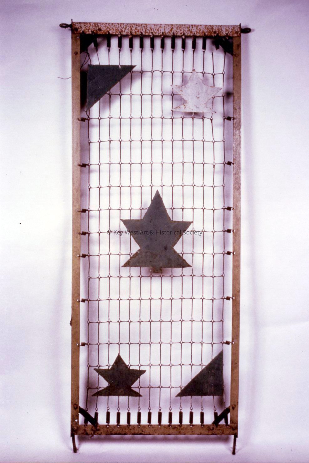 This is one of twenty-two fence panels all constructed from bed springs with painted sheet metal ornament. They originally formed an ornamental fence around Papio's museum. Small ornaments in the form of birds, palm trees or other plant or animal forms were placed between the panels on top of the fence at the joins to serve as a joining pin.Type of Sculpture