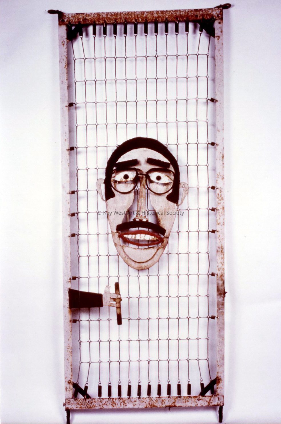 Freestanding sculpture by Stanley Papio depicting the face and hand of Groucho Marx. Composed of sheet metal mounted to a bed spring.