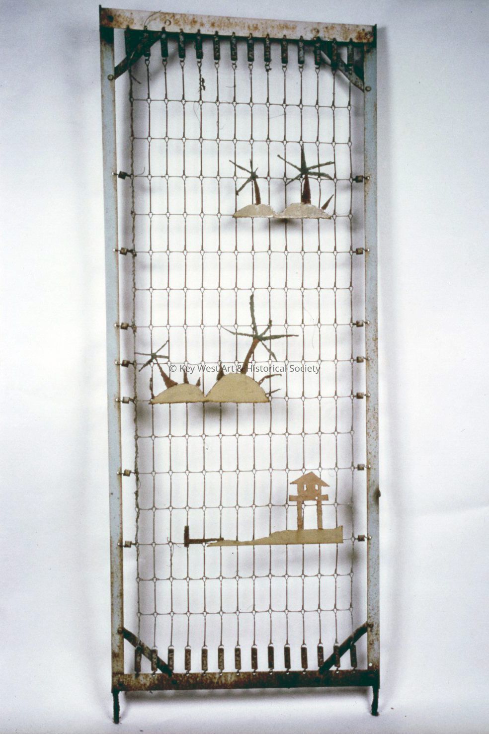 This is one of twenty-two fence panels all constructed from bed springs with painted sheet metal ornament. They originally formed an ornamental fence around Papio's museum. Small ornaments in the form of birds, palm trees or other plant or animal forms were placed between the panels on top of the fence at the joins to serve as a joining pin.Type of Sculpture