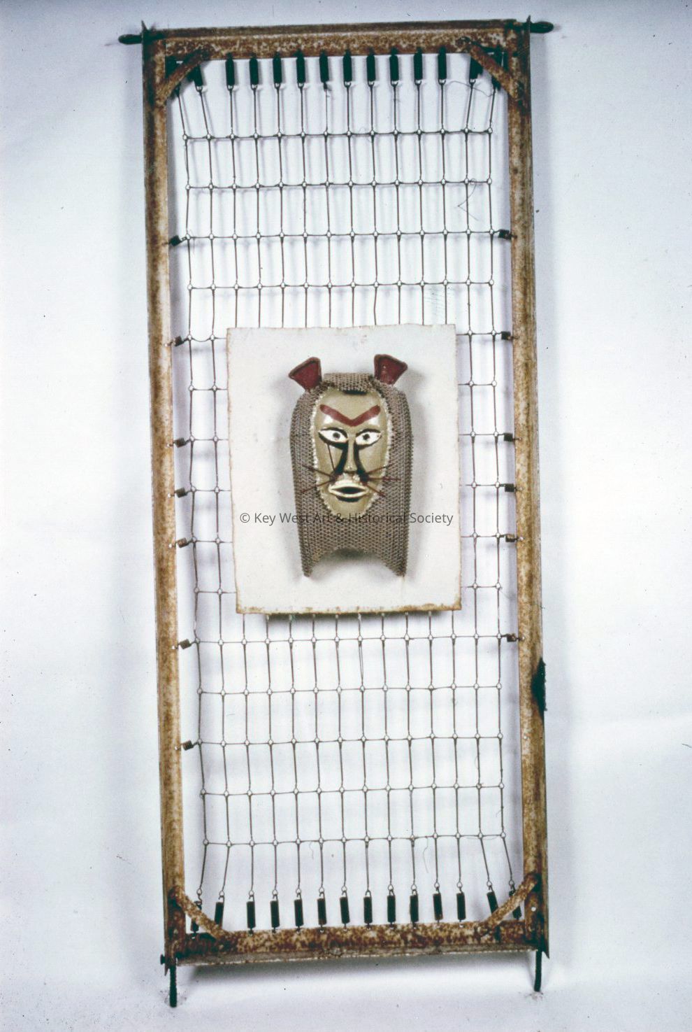 This is one of twenty-two fence panels all constructed from bed springs with painted sheet metal ornament. They originally formed an ornamental fence around Papio's museum. Small ornaments in the form of birds, palm trees or other plant or animal forms were placed between the panels on top of the fence at the joins to serve as a joining pin.Type of Sculpture