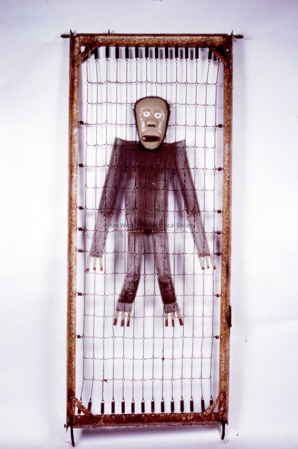 Freestanding sculpture by Stanley Papio depicting a monkey with a steel woven mesh body with head. Composed of sheet metal mounted to a bed spring.