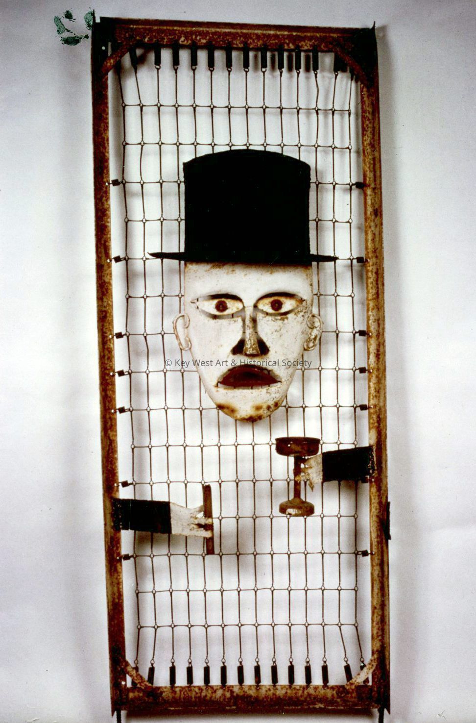 Freestanding sculpture by Stanley Papio depicting the face and hands of W.C. Fields wearing a black hat while holding a cigar and cocktail glass. Composed of sheet metal mounted to a bed spring.