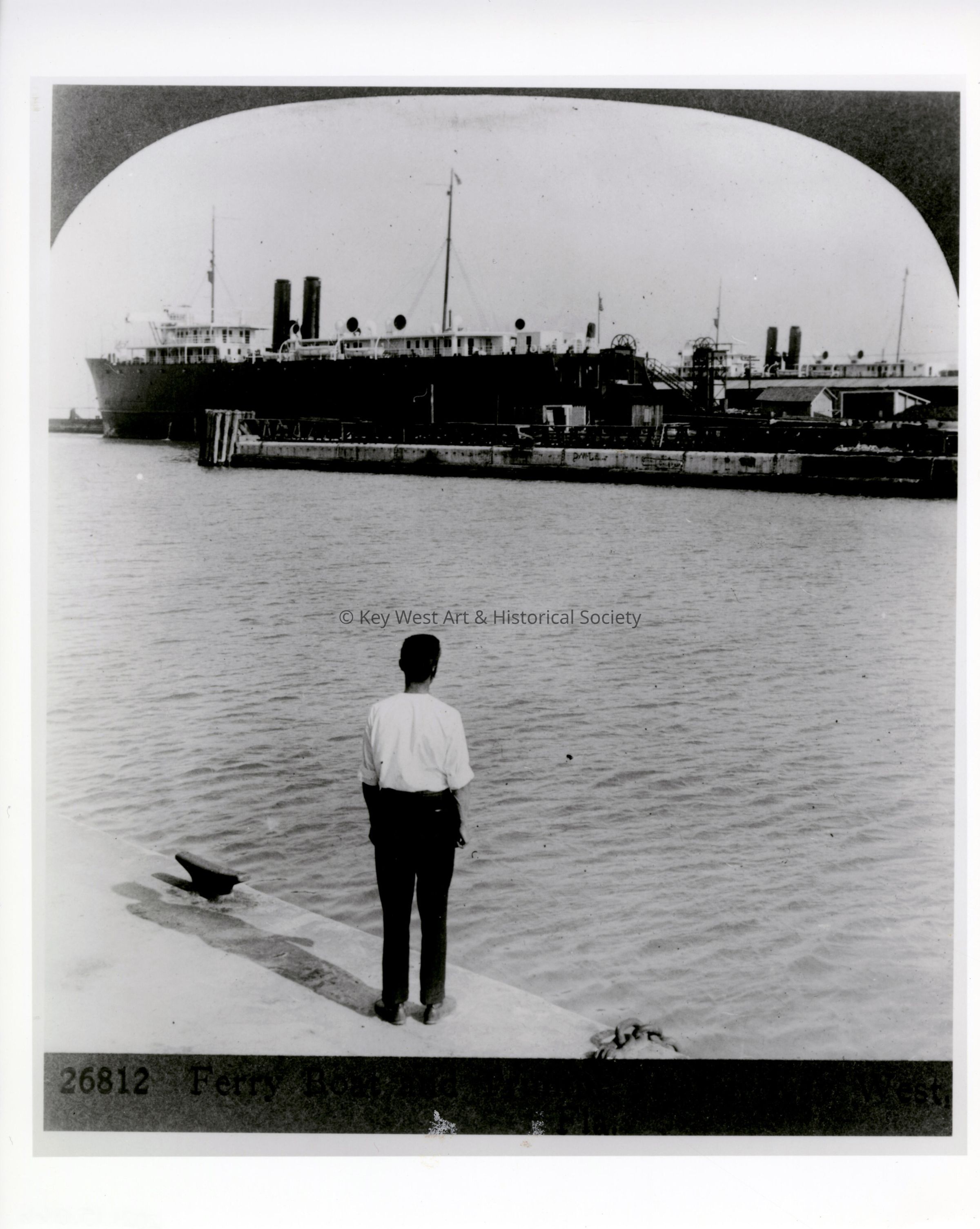 Black and white photograph of the Florida East Coast Railway train depot at Trumbo Point with a ferry boat in dock. The freight ferry ran between Key West and Cuba.