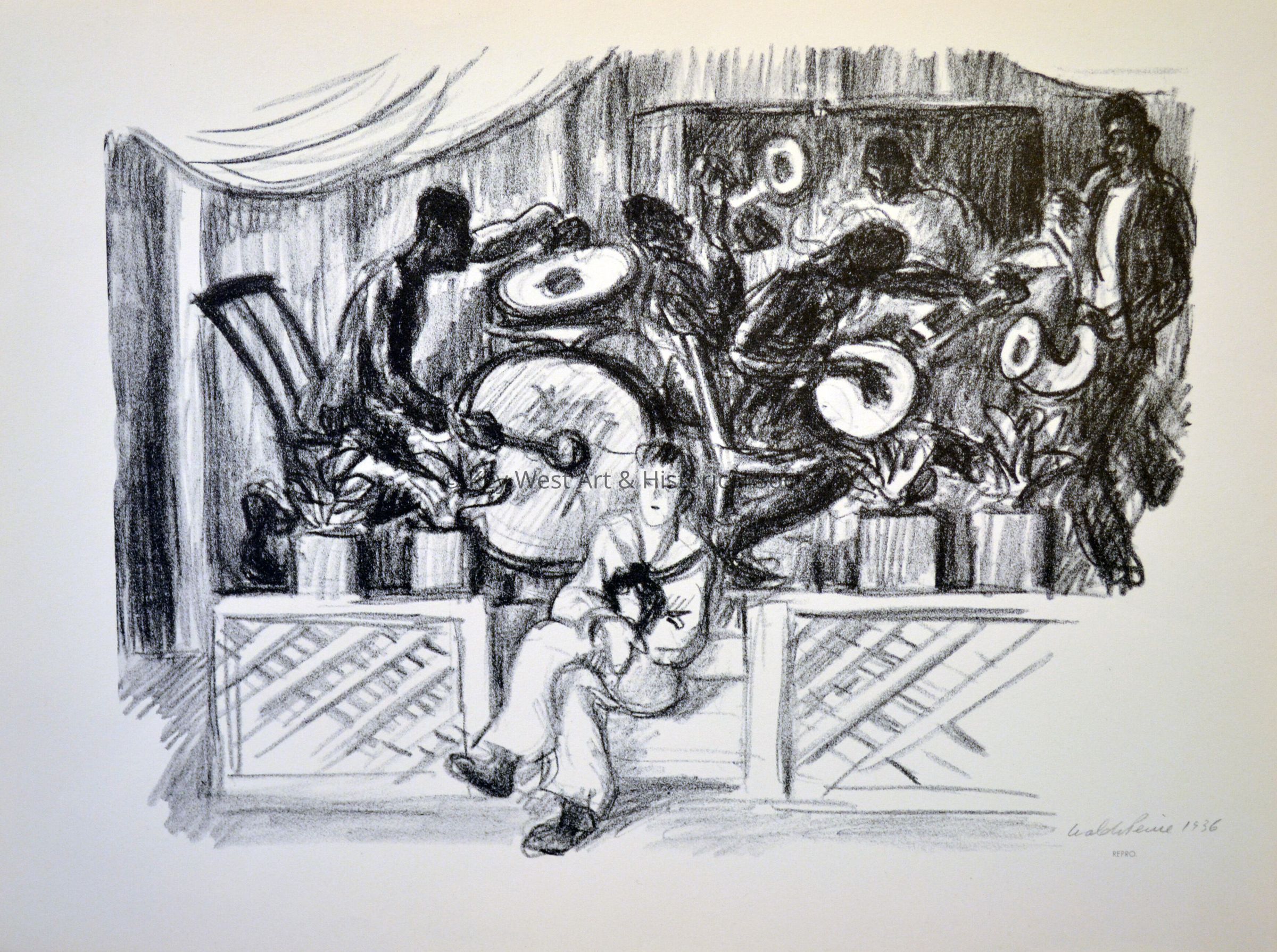 Print by Waldo Peirce depicting sailors dancing in front of band at the Silver Slipper Bar operated by Sloppy Joe Russell.  Printed on the reverse, 'After banging around quite a bit, getting an education, making the Grand Tour, and living in all sorts of strange places, Waldo Peirce say that he is 'well content to return to his native Maine,' where he was born fifty-five years ago.  'I think it's a fortunate artist,' Peirce declares, 'who has a birthplace and environment he is happy to return to after the Grand Tour, etc., and he should do his best in his home country...not as a regional purveyor of small beer, etc., but cosmically in harmony with what is about him—land, sea, sky, people, etc., whereby his art, if any good, becomes international, and not local.'  'Negro Band blares out hot rhythms at the Silver Slipper, a Key West dance hall.'Collection