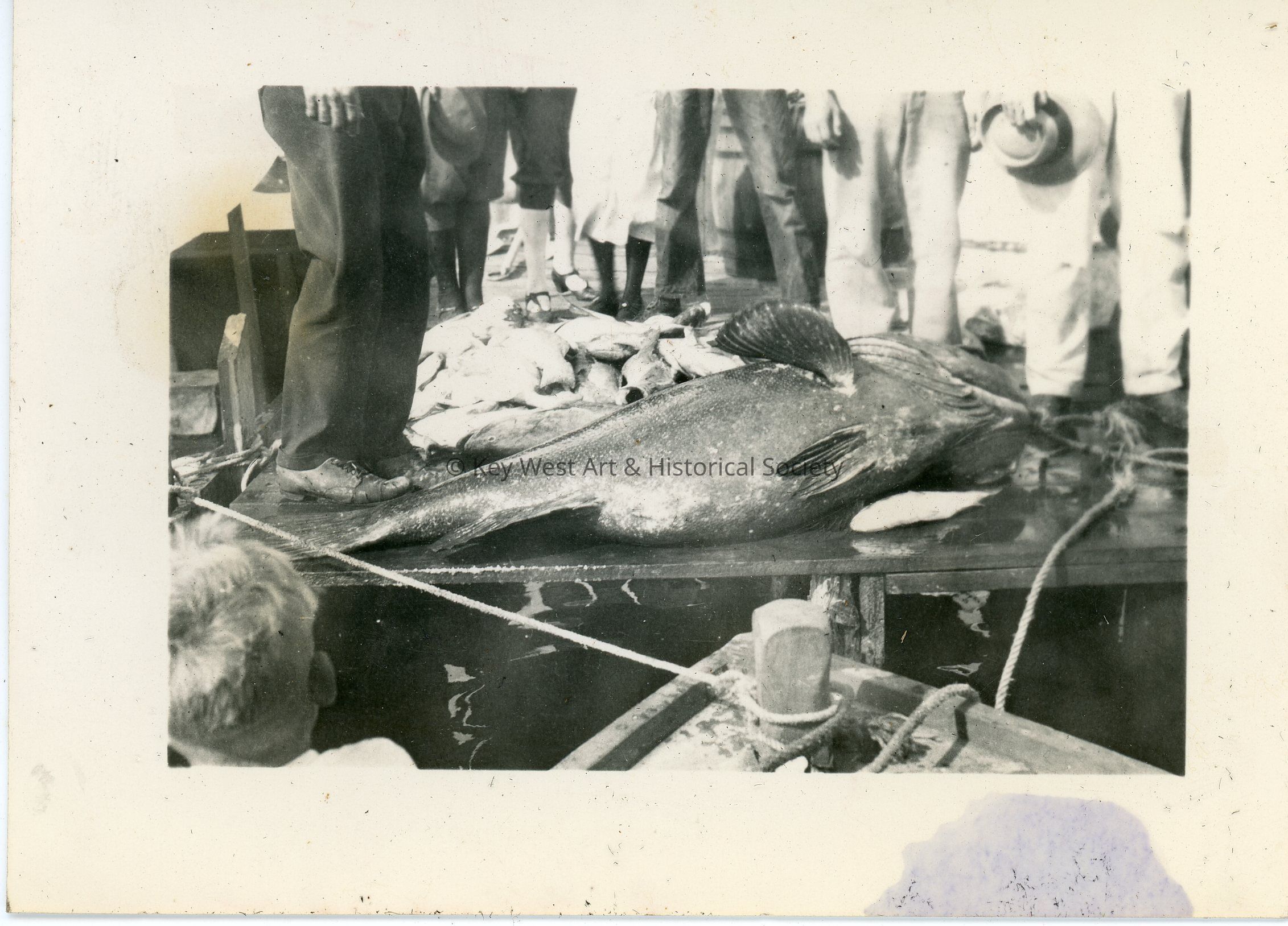 Black and white photograph of several figures standing around a large fish on the dock. The bow of a boat is in the foreground. The photo was part of a photograph album began by Victor H. Baker in 1940.