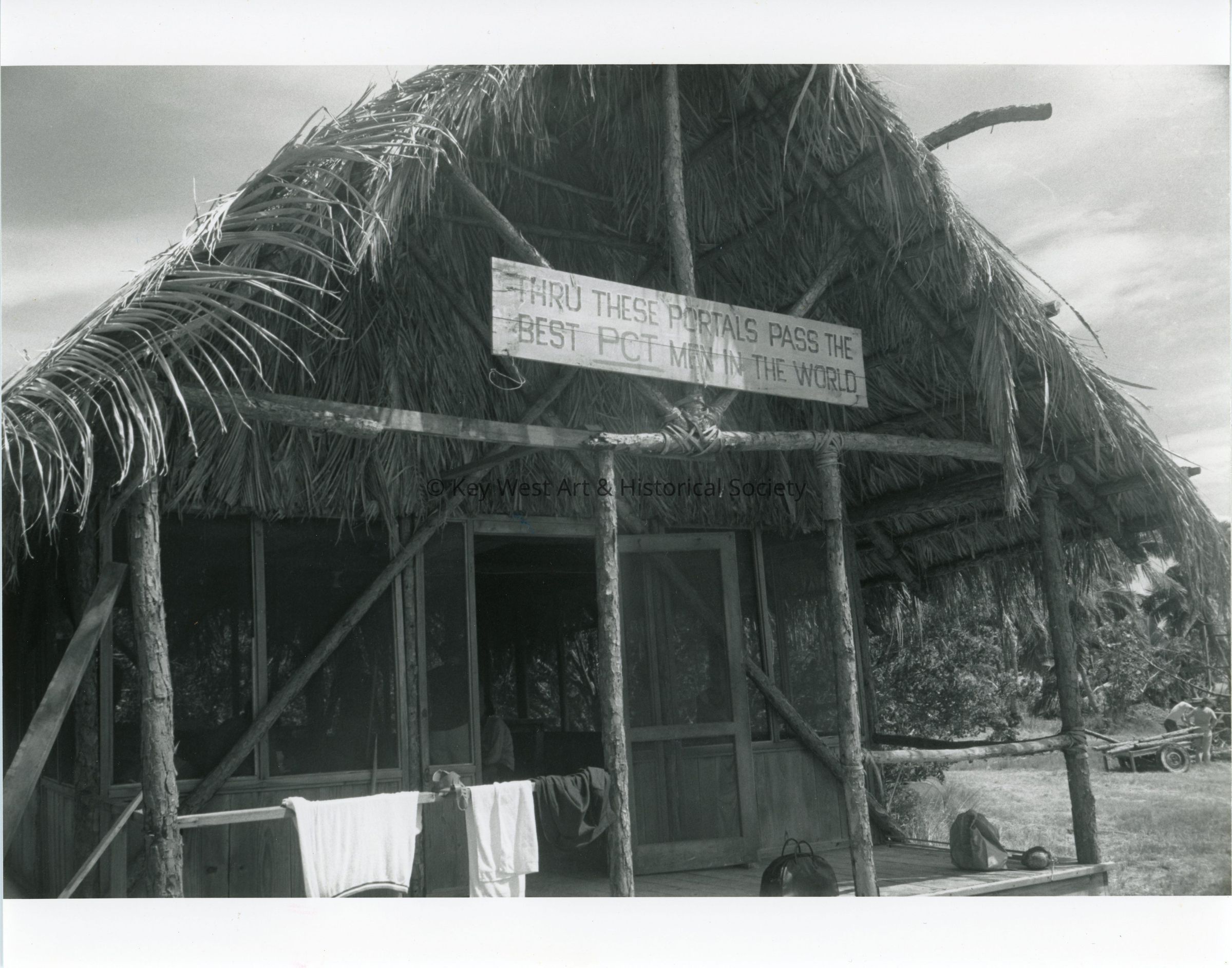 Black and white photograph of a wood structure with a thatched roof on the set of the movie 'PT 109' on Munson Island. A sign above the entryway reads 'Thru These Portals Pass The Best PCT Men In The World.' The film was directed by Leslie H. Martinson and stars Cliff Robertson as Lieutenant Junior Grade John F. Kennedy.