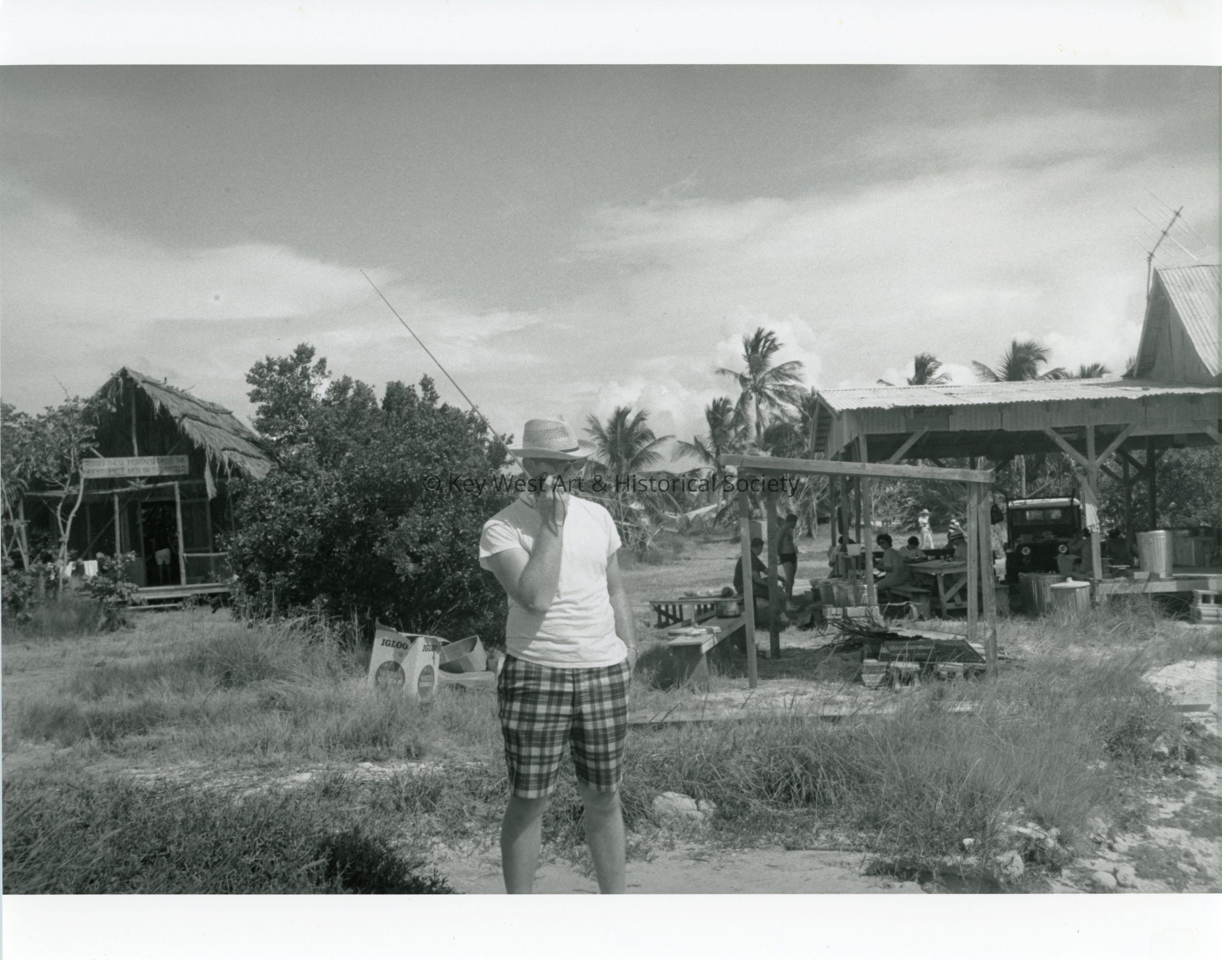 Black and white photograph of film crew on the set of the movie 'PT 109' on Munson Island. In the foreground is a man in a short brim fedora speaking into a hand radio with a long antenna. The film was directed by Leslie H. Martinson and stars Cliff Robertson as Lieutenant Junior Grade John F. Kennedy.