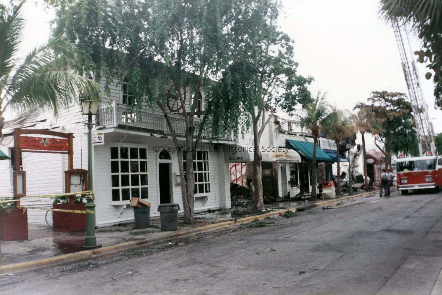 Color photograph of the damage sustained during a large fire at The Copa on the 600 block of Duval Street including Dim Sum and Aca Joe.