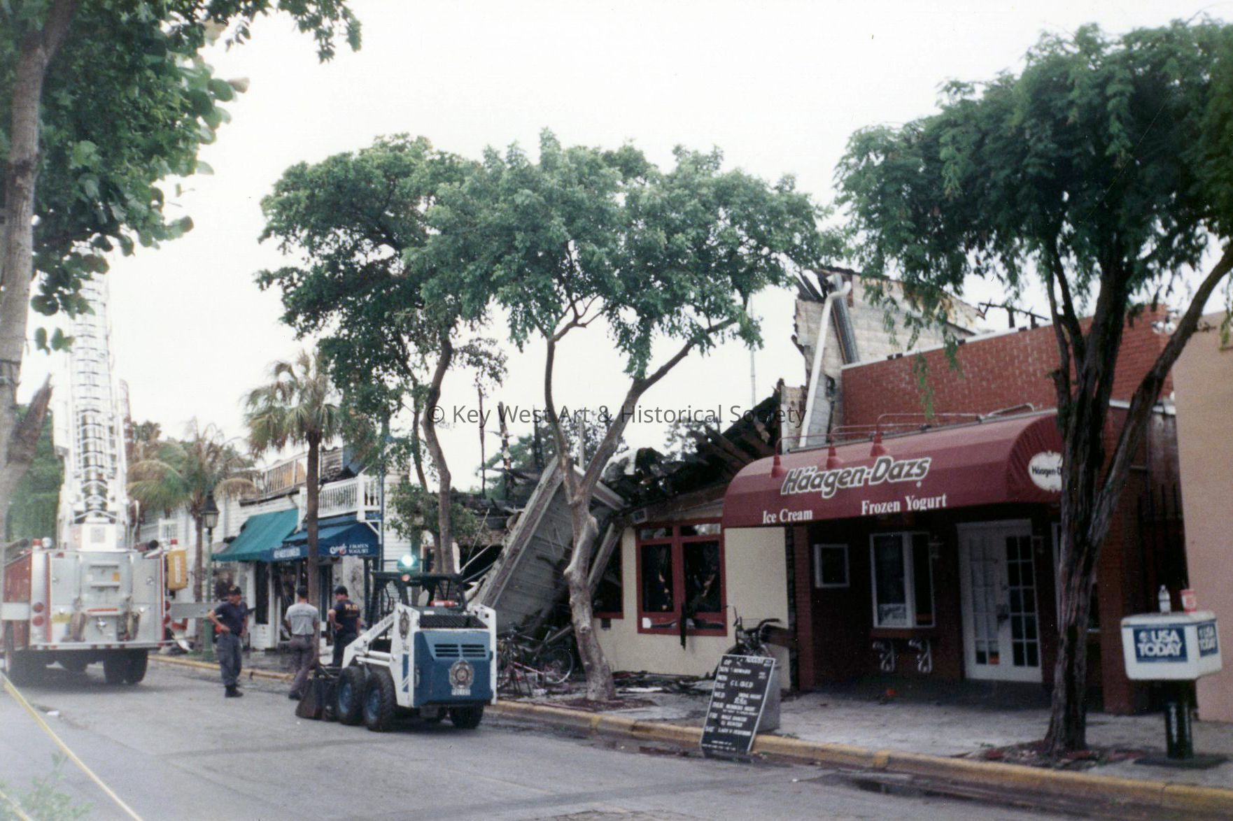 Color photograph of the damage sustained during a large fire at The Copa on the 600 block of Duval Street including Haagen-Dazs.
