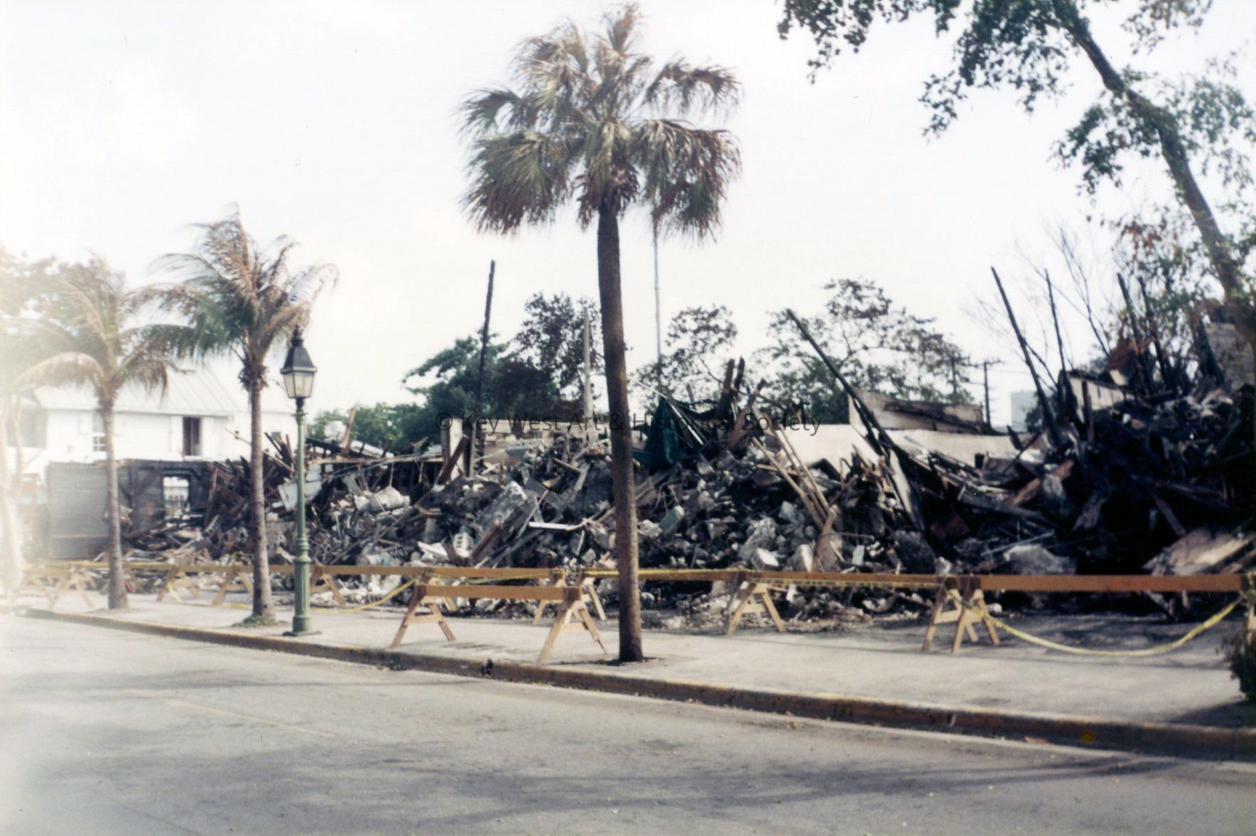 Color photograph of the damage sustained during a large fire at The Copa on the 600 block of Duval Street. Photograph taken after the damaged buildings were razed.