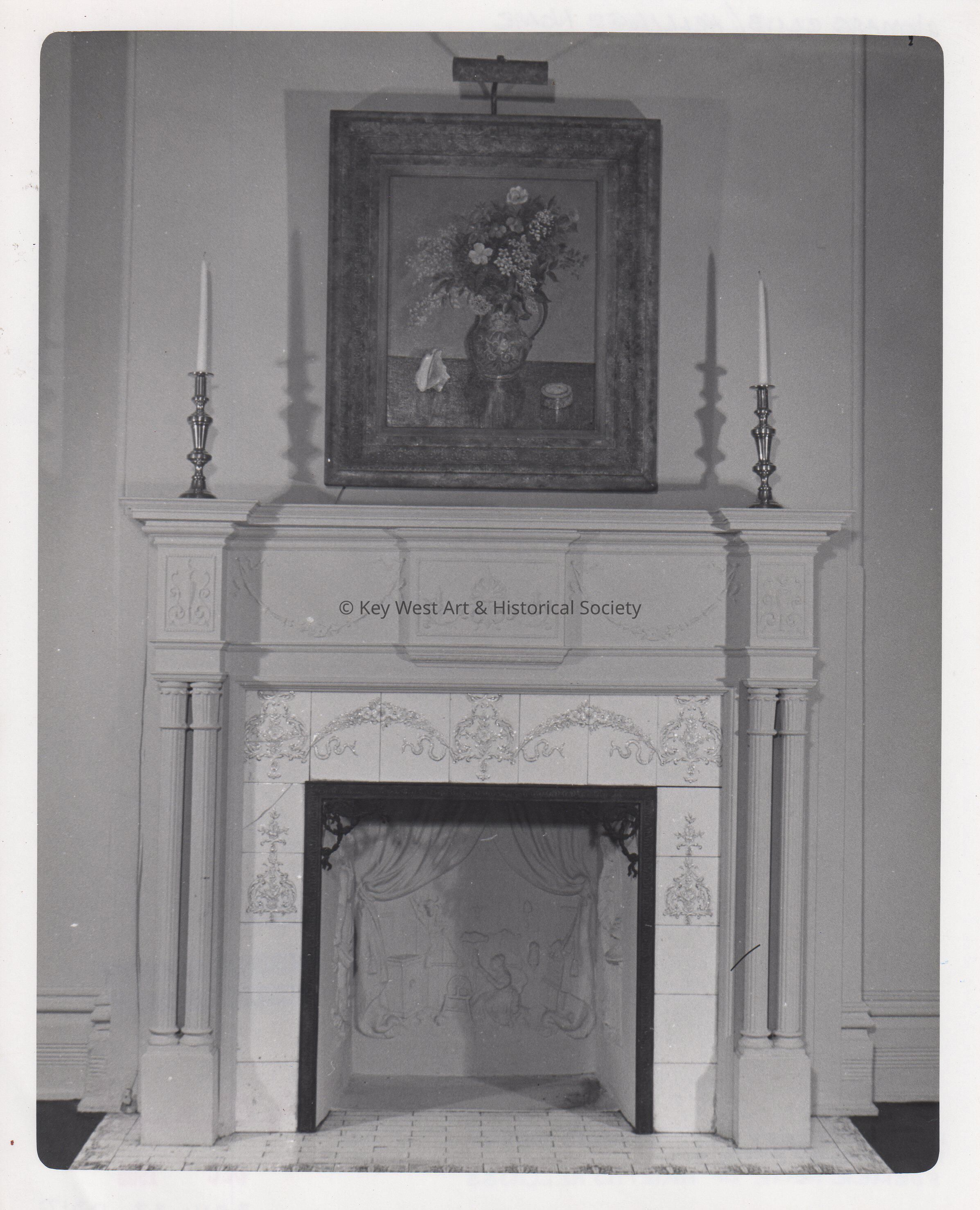 Black and white photograph of the fireplace in the Key West Woman's Club at 319 Duval Street, the former home of Martin Hellings. The painting hanging above the fireplace was created by by Gene Otto.
