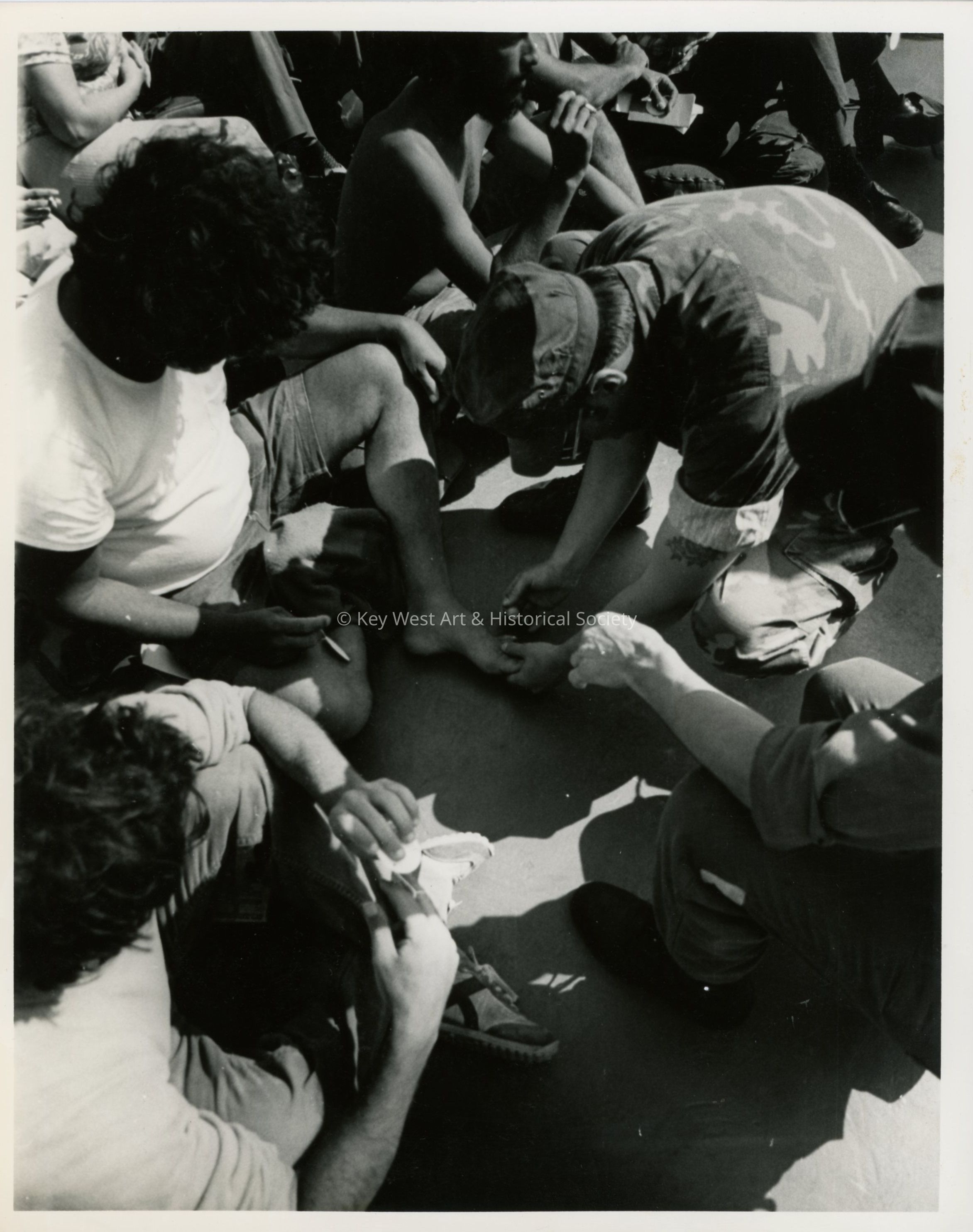 Black and white photograph of Hospital Corpsman third class Jeff Maletz of Camp Lejeune, NC, administers first aid to a Cuban refugee aboard the Assault Craft Vessel 1659 in the Florida Straights.