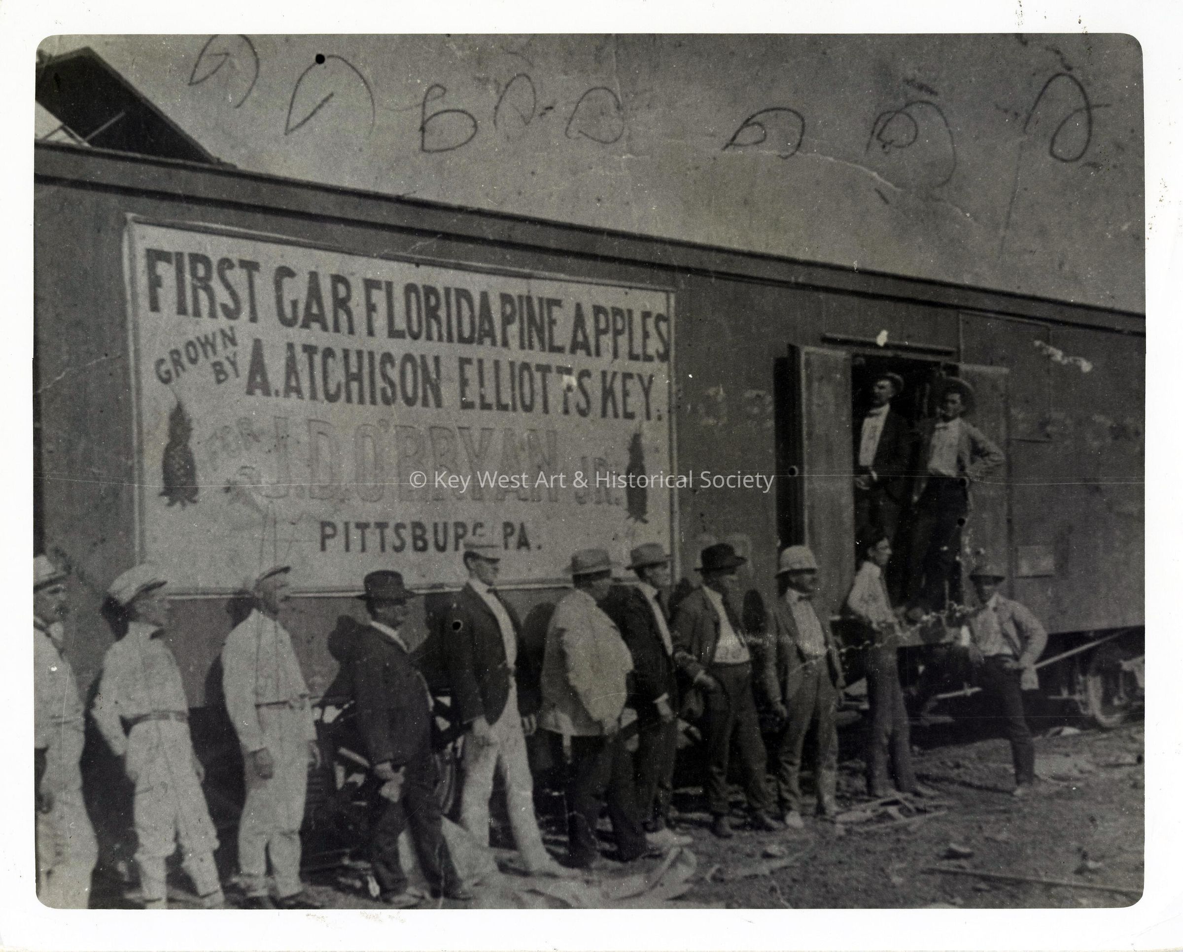 Black and white photograph of the first freight car of Florida pineapples sent via the Florida East Coast Railway by A. Atchison of Elliott Key.