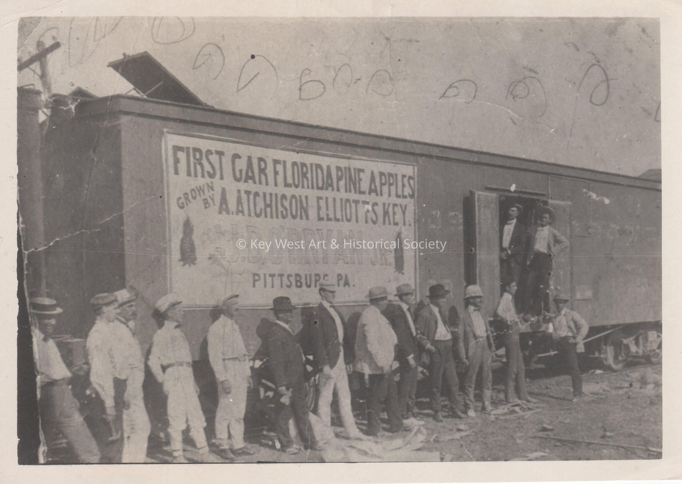 Black and white photograph of the first freight car of Florida pineapples sent via the Florida East Coast Railway by A. Atchison of Elliott Key.