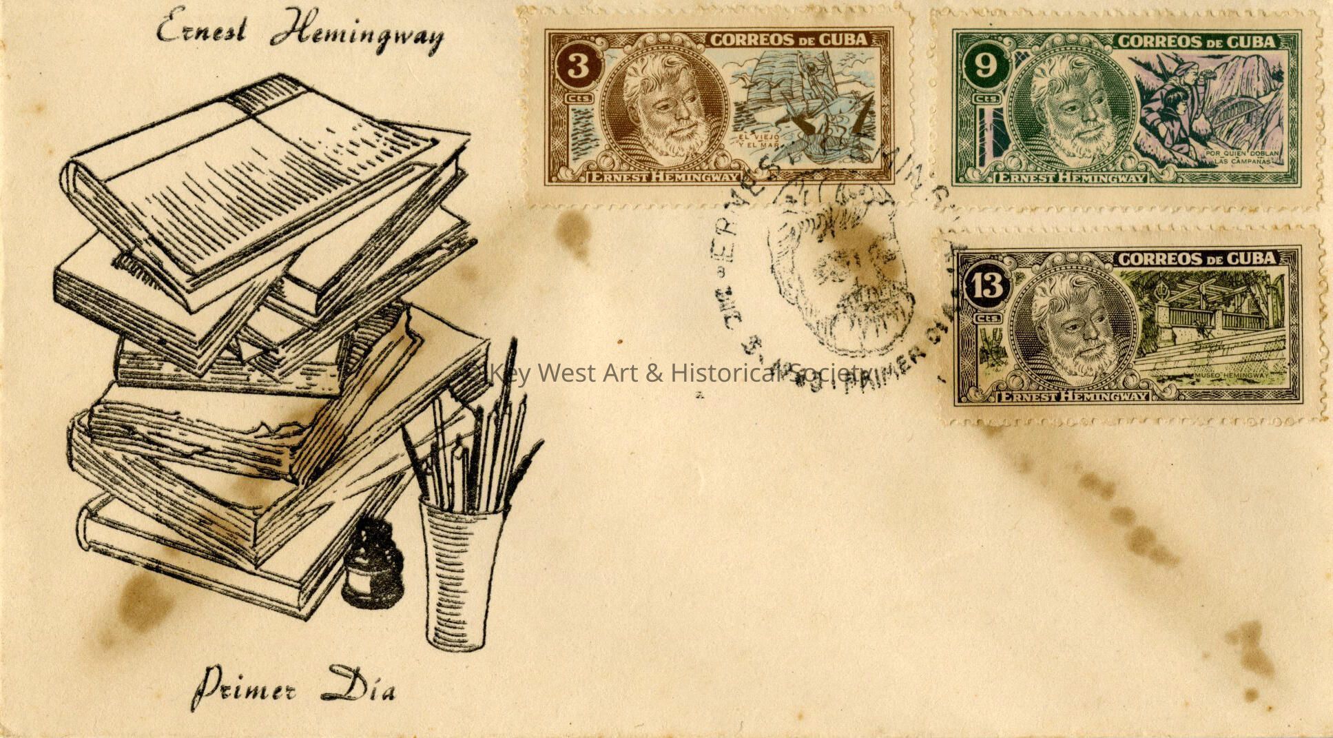 Paper envelope with three stamps issued by Cuba to honor Ernest Hemingway. The stamps and postmark were issued on the first day and are attached to the envelope decorated with a stack of books, an ink well and pens.