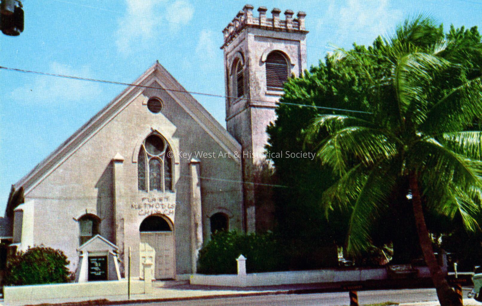 Postcard depicting the First Methodist Church (Old Stone Church) at 600 Eaton Street. Notation on verso, 'First Methodist Church. Called 'Old Stone Church', magnificent wild fig tree at right. In Key West, Florida.'Subject Place