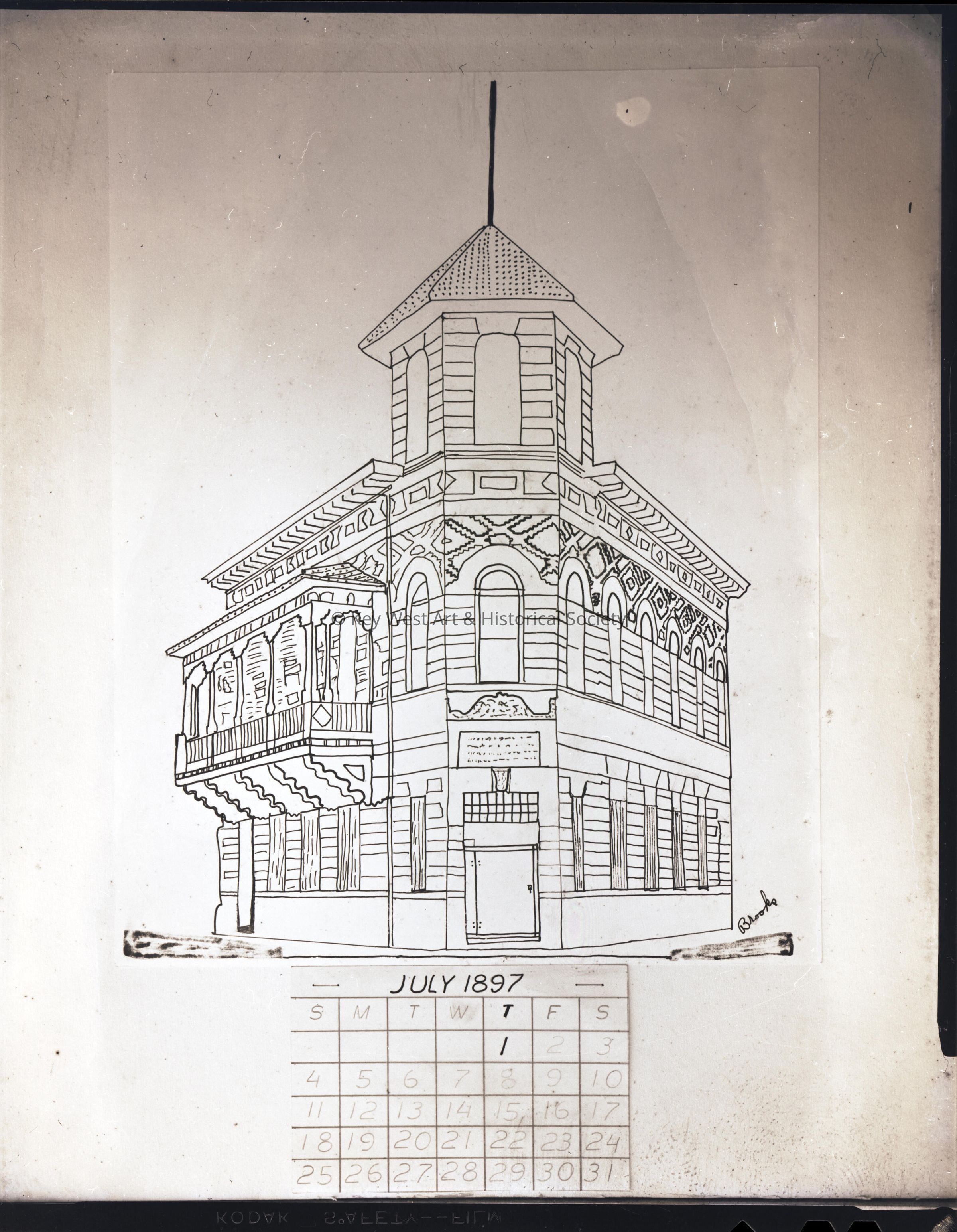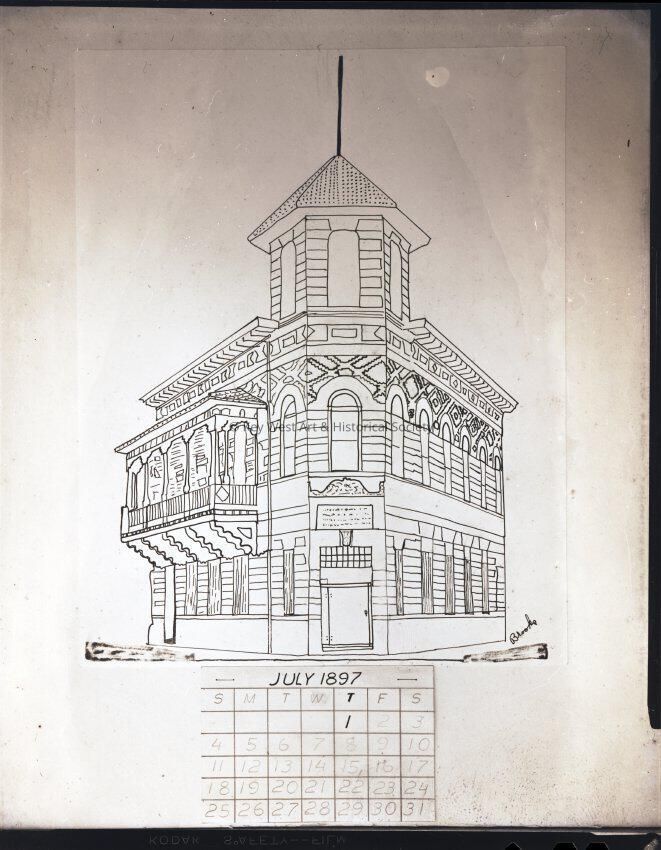 Photographic negative depicting the First National Bank that stood at the corner of Duval Street and Front Street in Key West, Florida.