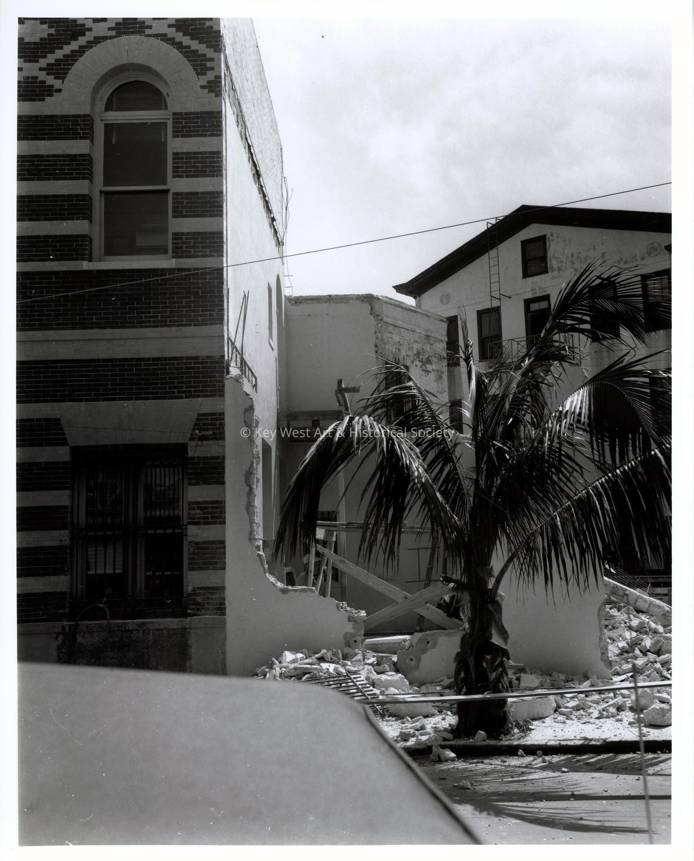 Black and white photograph of the demolition of the building adjacent to the First National Bank of Florida on the corner of Duval and Front streets.