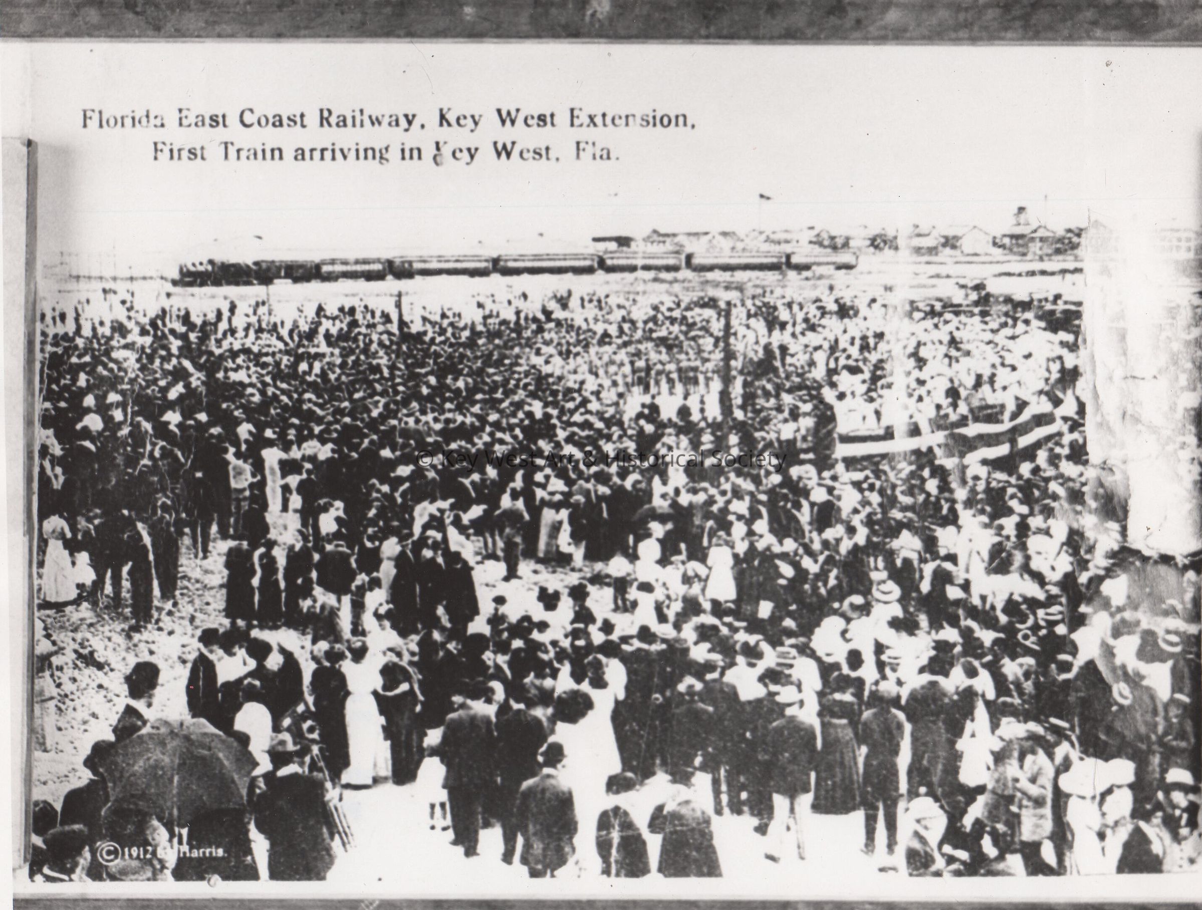 Black and white photograph of a large crowd watching the arrival of the first Florida East Coast Railway to Key West carrying Henry M. Flagler.Collection