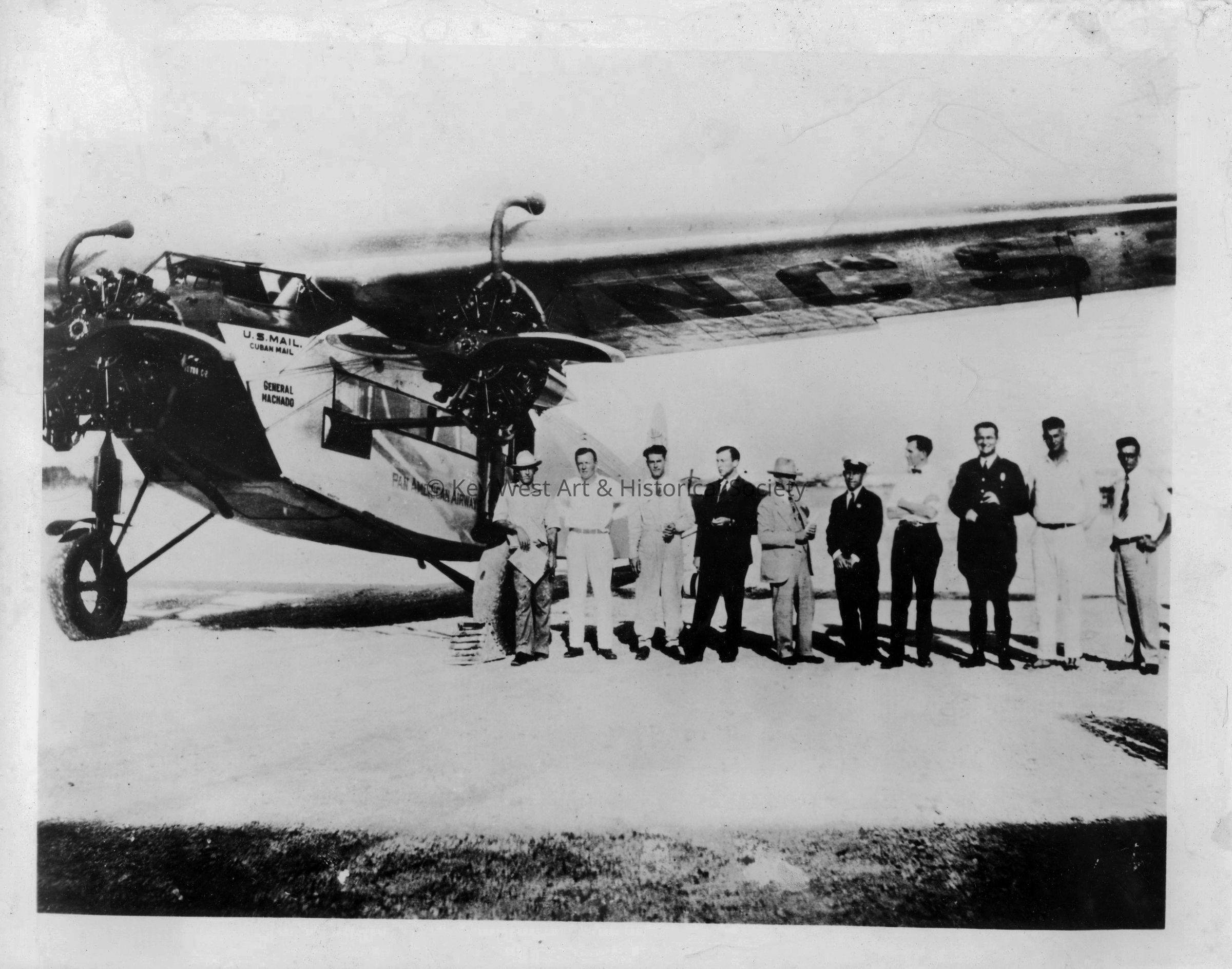 Black and white photograph of the Fokker F-7 trimotor 'General Machado' that made the first Pan-Am passenger flight ago between Key West, Florida, and Havana, Cuba on October 28, 1927. This is a 'family portrait' with Pan Am staff at Key West airport. From the left Henry Barcello, Fred Gelhaus, Gus Alfonso, C.D. Swinson, Charles Morgan, Custom Officer, John Beck, Immigration Officer, C.D. 'Slim' Pippinger and Stephen Floyd Whalton.Photograph Details