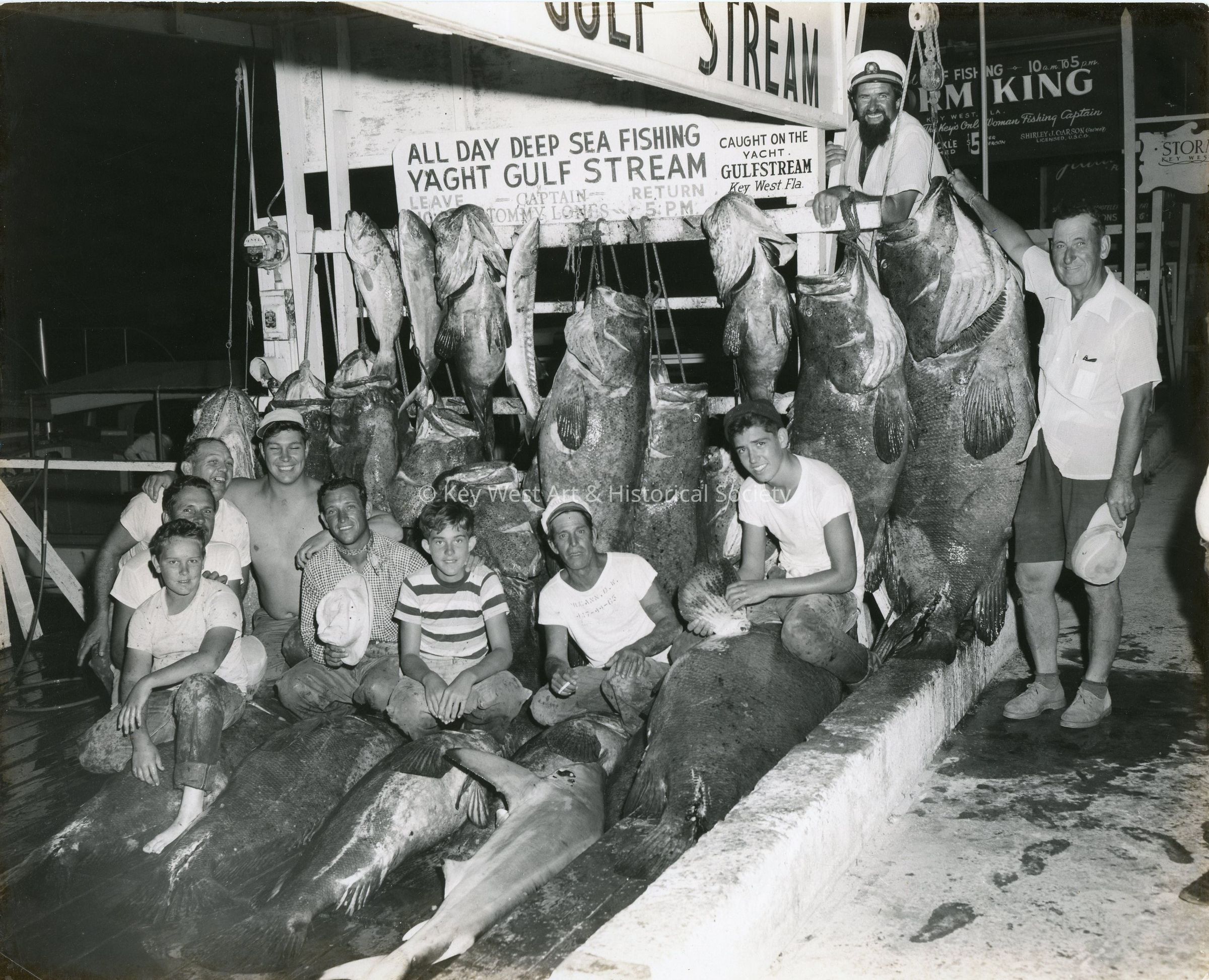 Black and white photograph of a large catch of goliath grouper on the charter boat Gulfstream with Captain Tommy Lones standing in back. Joe Mercurio is sitting atop the grouper, Curry Blackwell is sitting in front on the left and T-T Crespo is wearing the sailor's hat.