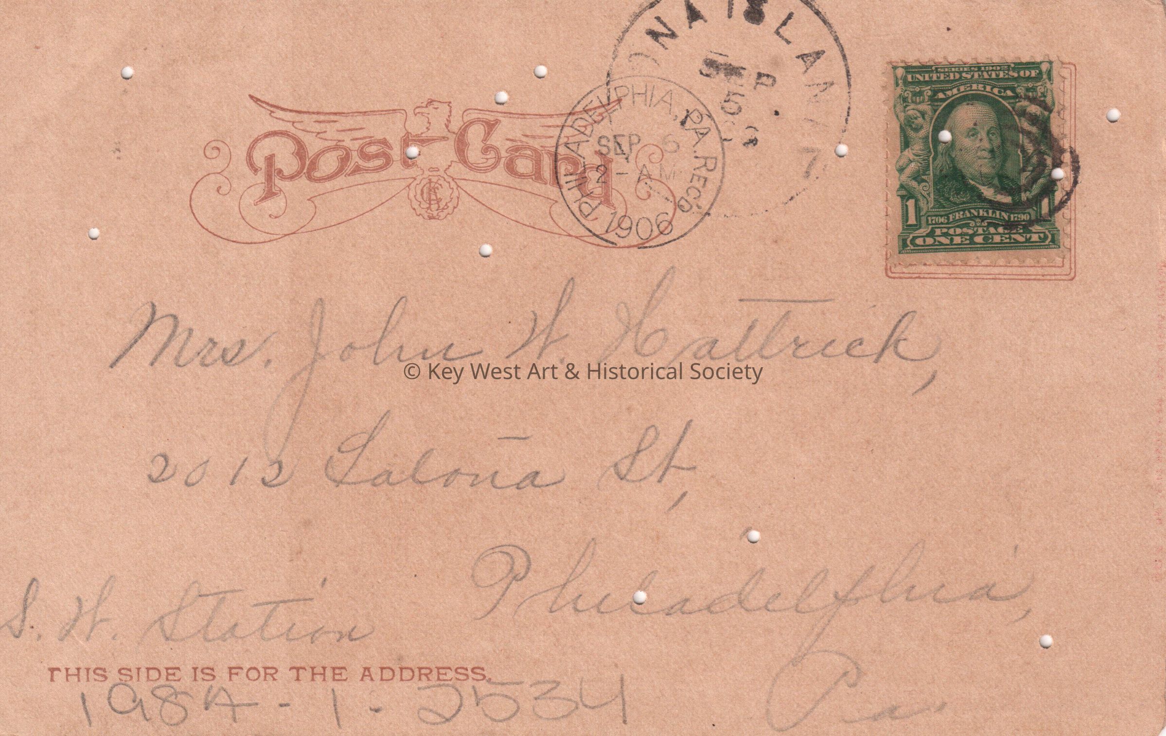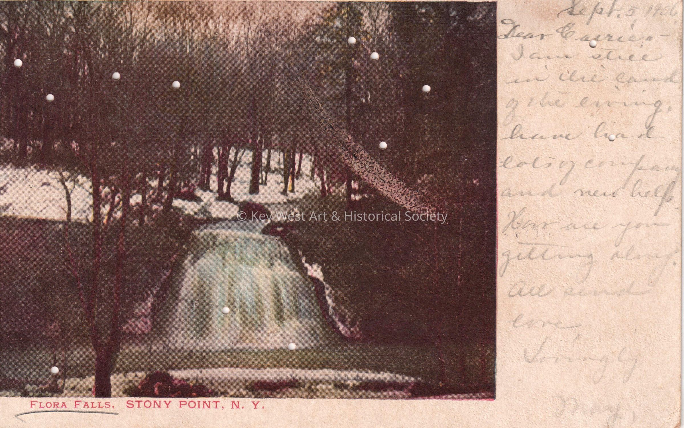 Postcard depicting a waterfall in snowy woods. The caption reads, ‘Flora Falls, Stony Point, New York’. The message on the front reads, ‘September 5, 1906, Dear Carrie, I am still in the land of the living. Have had lots of company and new help. How are you getting along? All send love. Lovingly, May’. The card is addressed to Mrs. John W. Hattrick, 2012 Latona Street, Southwest Station, Philadelphia, Pennsylvania, and is postmarked Philadelphia, September 6, 1906.Subject Place