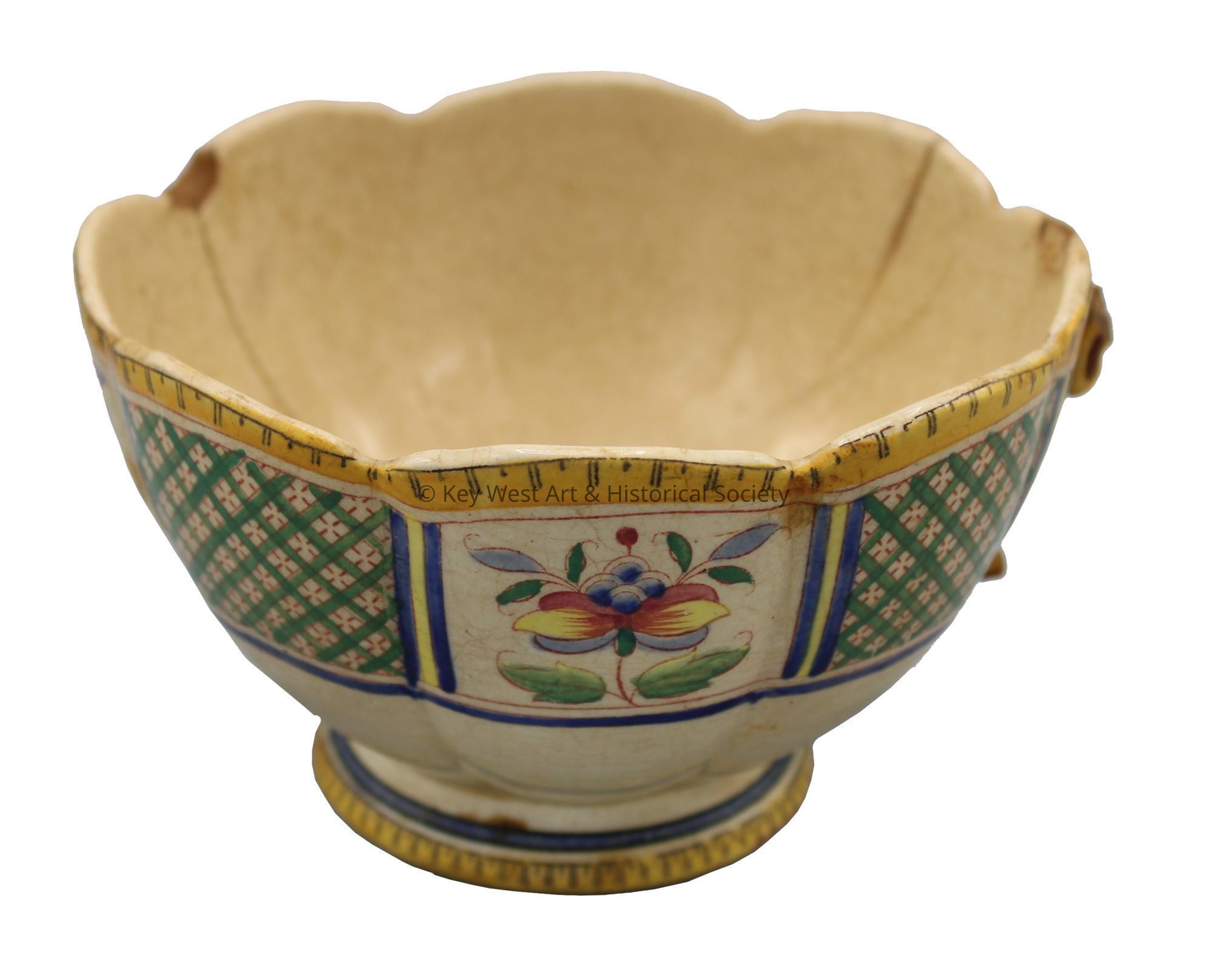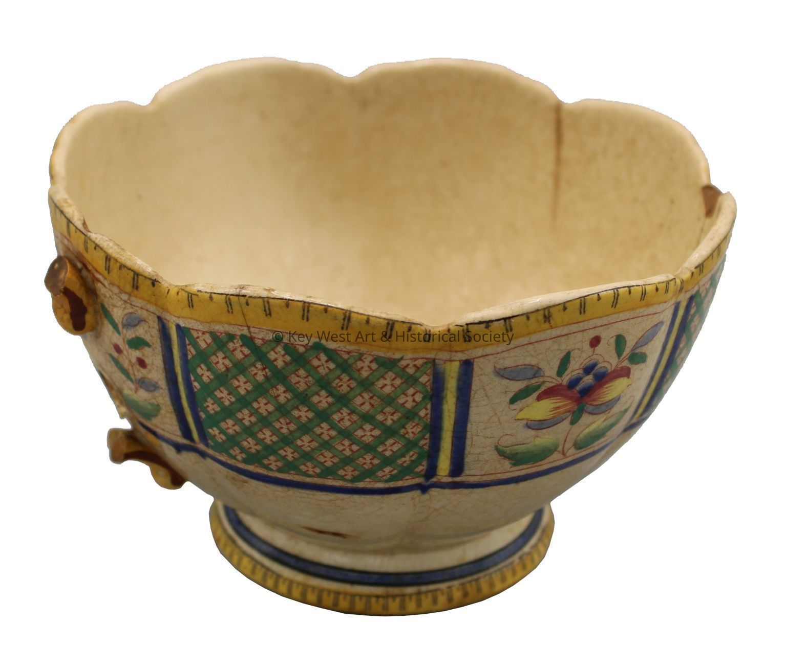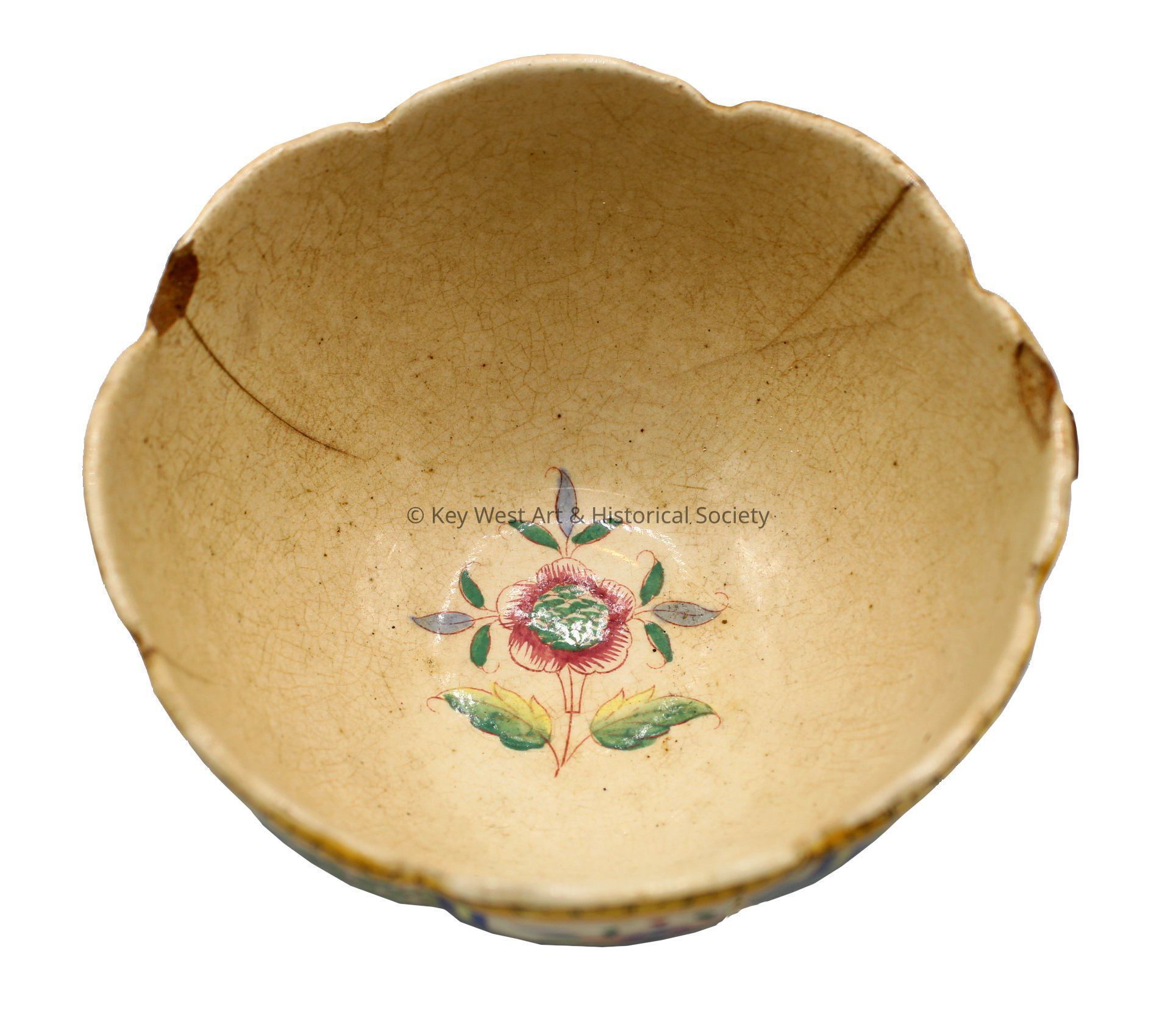 Glazed ceramic teacup with a scalloped mouth. The exterior of the cup features a multicolored floral and geometric motif with a yellow and blue border. The foot of the cup shares the yellow and blue border design. The interior of the cup has a single flower with leaves. The handle of the cup is broken off. The cup was purportedly captured from a Spanish ship during the Spanish-American War.