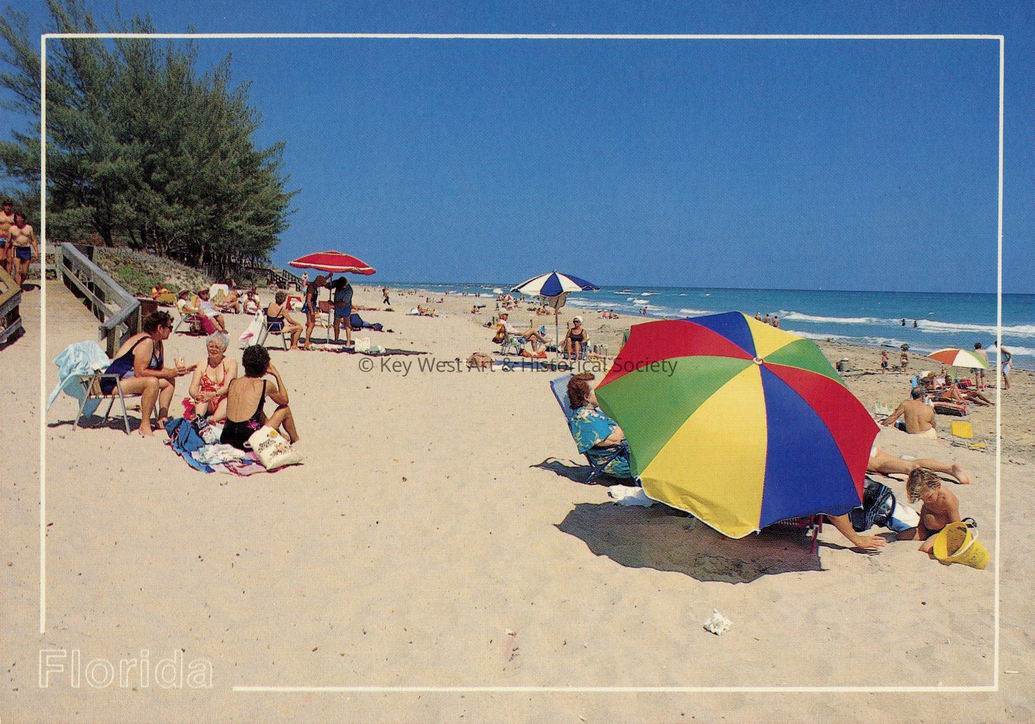 Postcard depicting a Florida beach scene with sunbathers and swimmers. Notation on verso, 'Typical tranquil beach scene on one of Florida's famous beaches.'