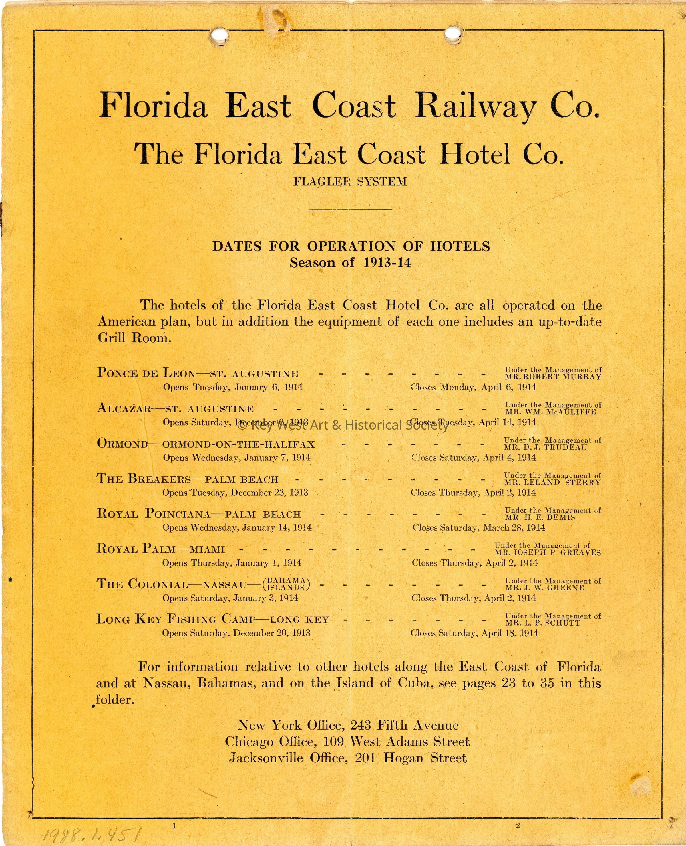 An informational folder for the Florida East Coast Railway Co. and Florida East Coast Hotel Co. Included are the 1913-1914 seasonal dates of operation for the various Flagler Hotels, international connections, service schedules for the railway, and the hotels and boarding houses found along the system.Collection