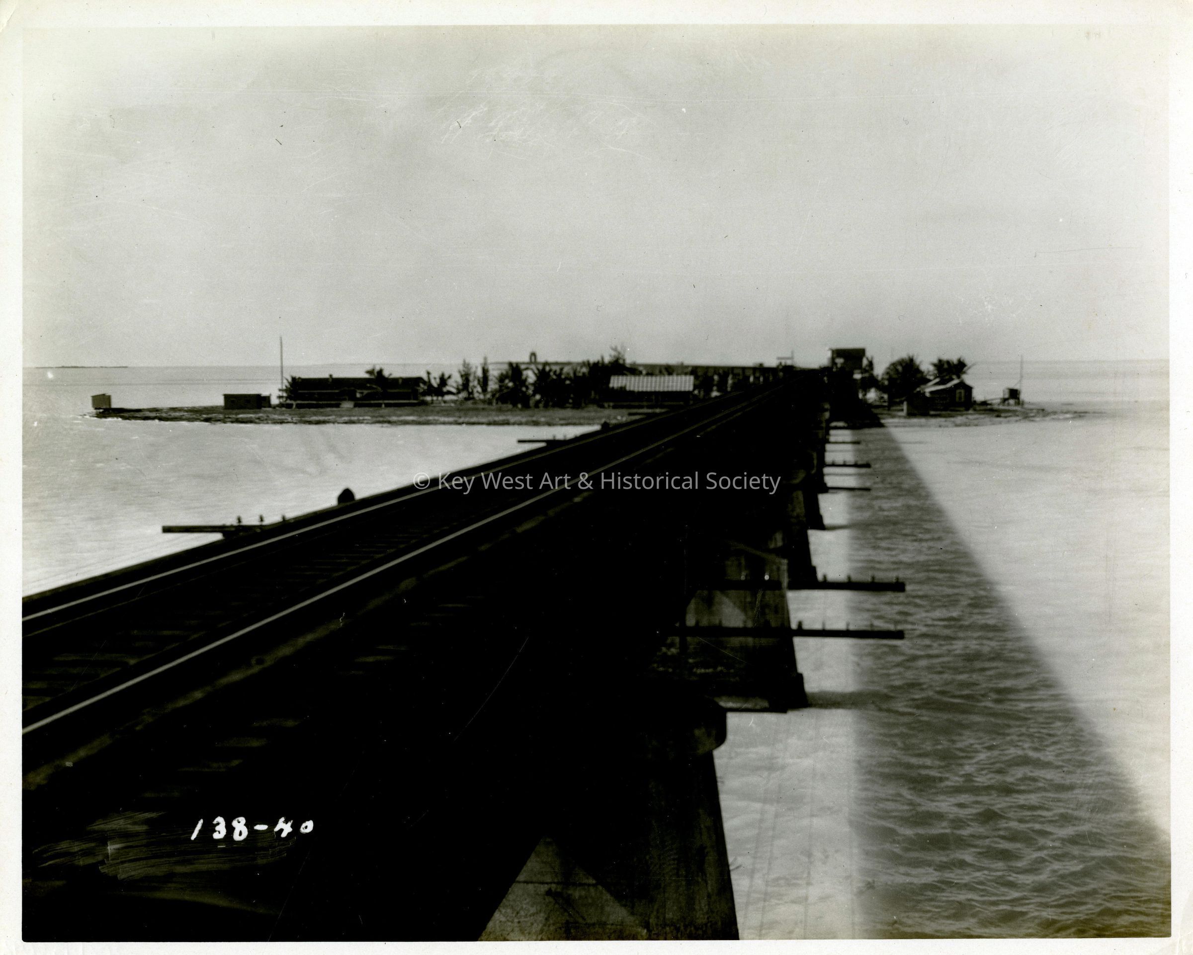 Black and white photograph of Florida East Coast Railway's Seven Mile Bridge approaching Pigeon Key.