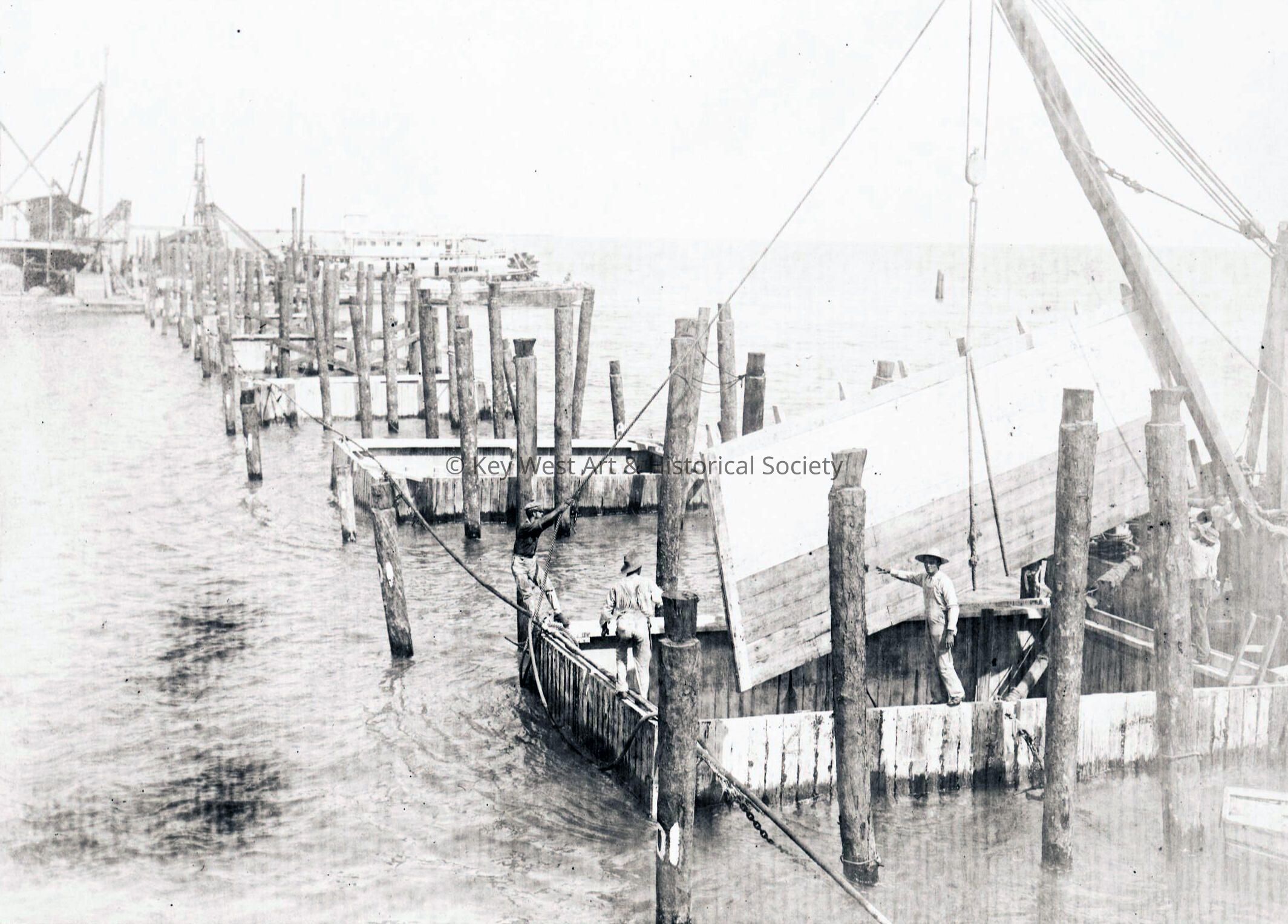 Black and white negative of Florida East Coast Railway workers placing panels to form a cofferdam during the construction of a railway bridge.