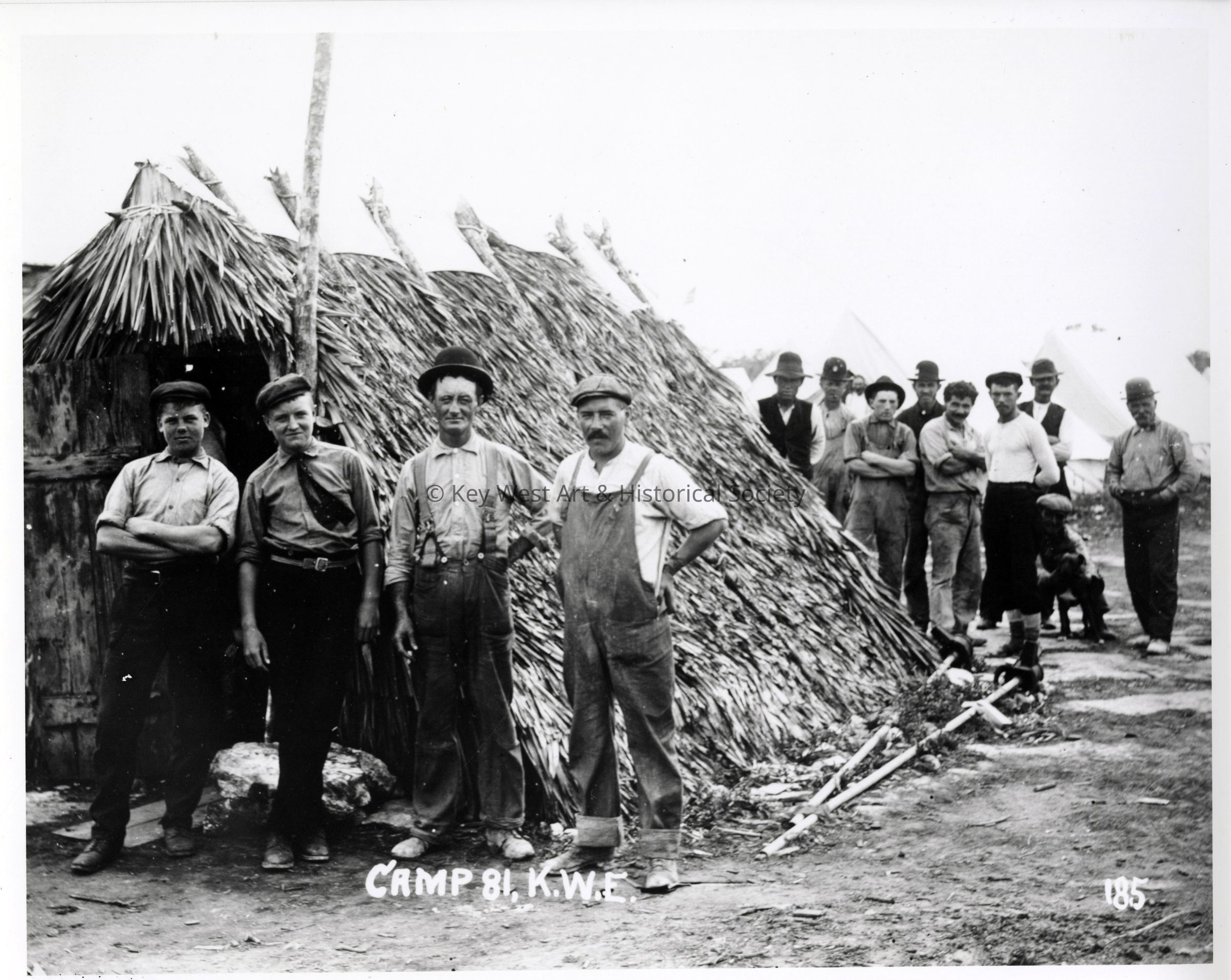 Black and white photograph of Florida East Coast Railway construction workers at Camp 81 on Summerland Key.
