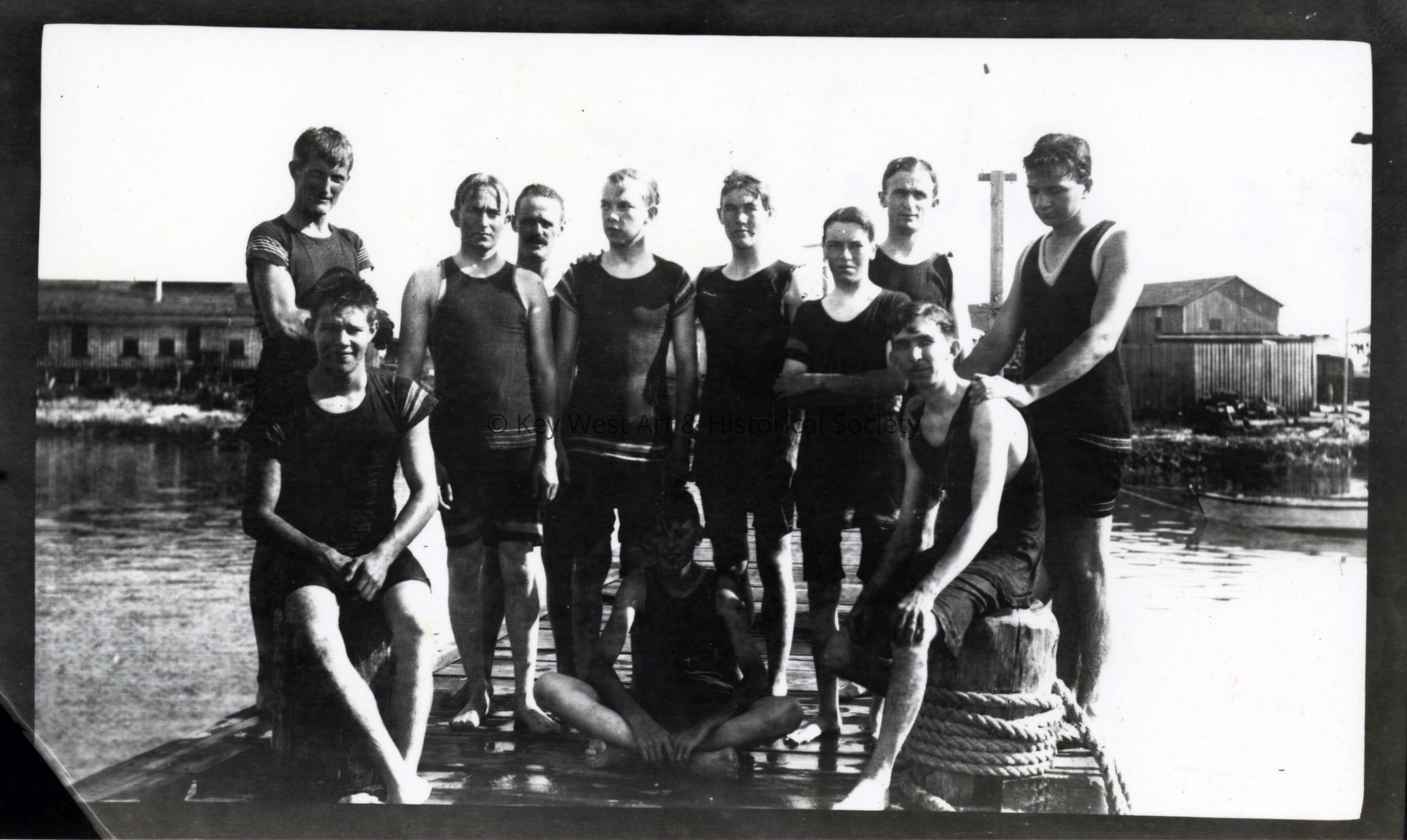 Black and white photograph of Florida East Coast Railway construction workers swimming in Marathon.