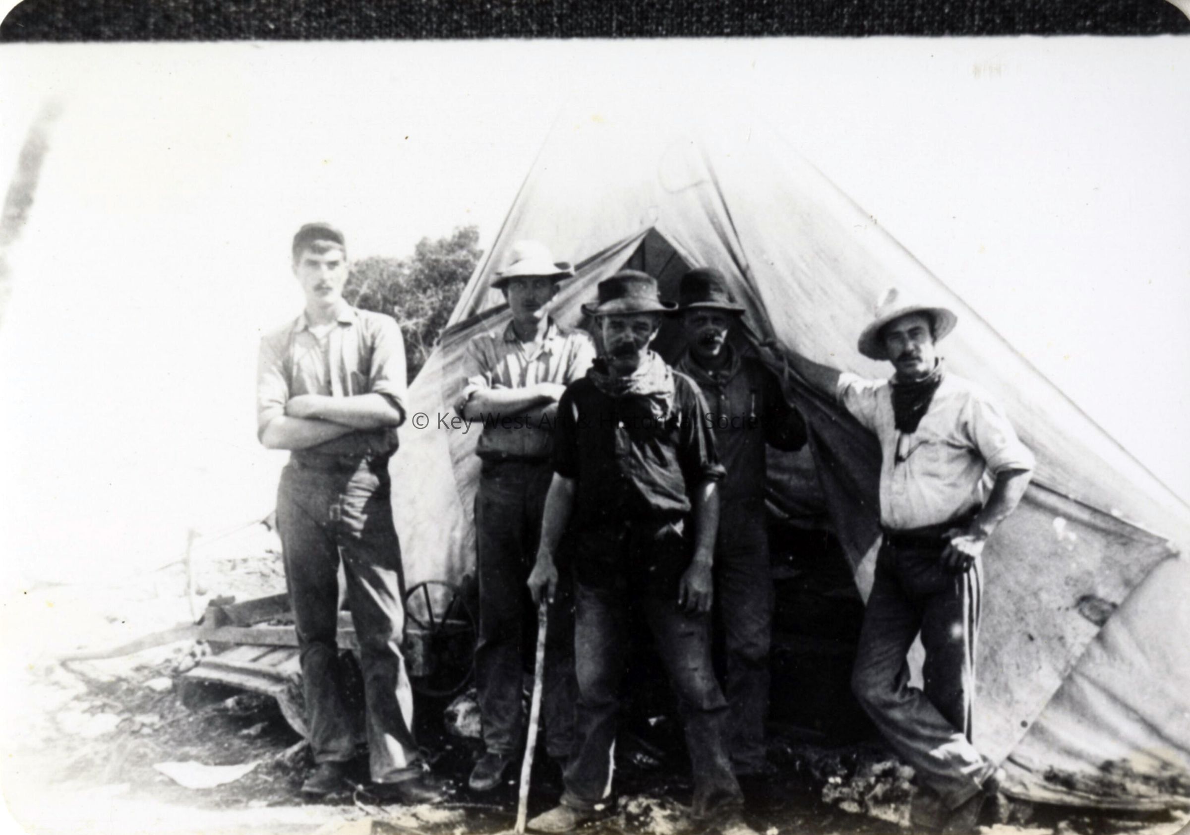 Black and white photograph of Florida East Coast Railway workers standing in front of canvas tent.