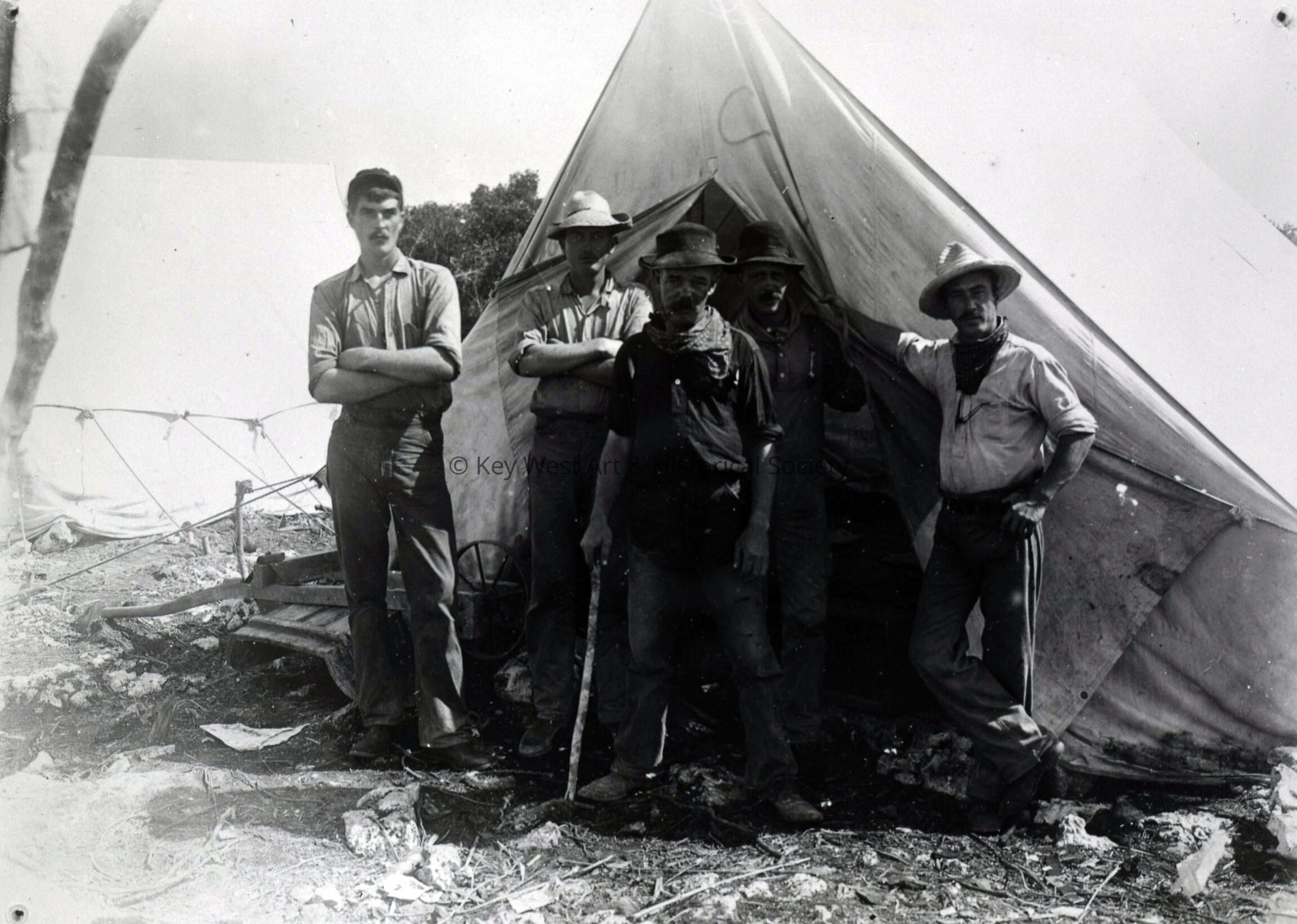 Black and white negative of Florida East Coast Railway workers standing in front of canvas tent.