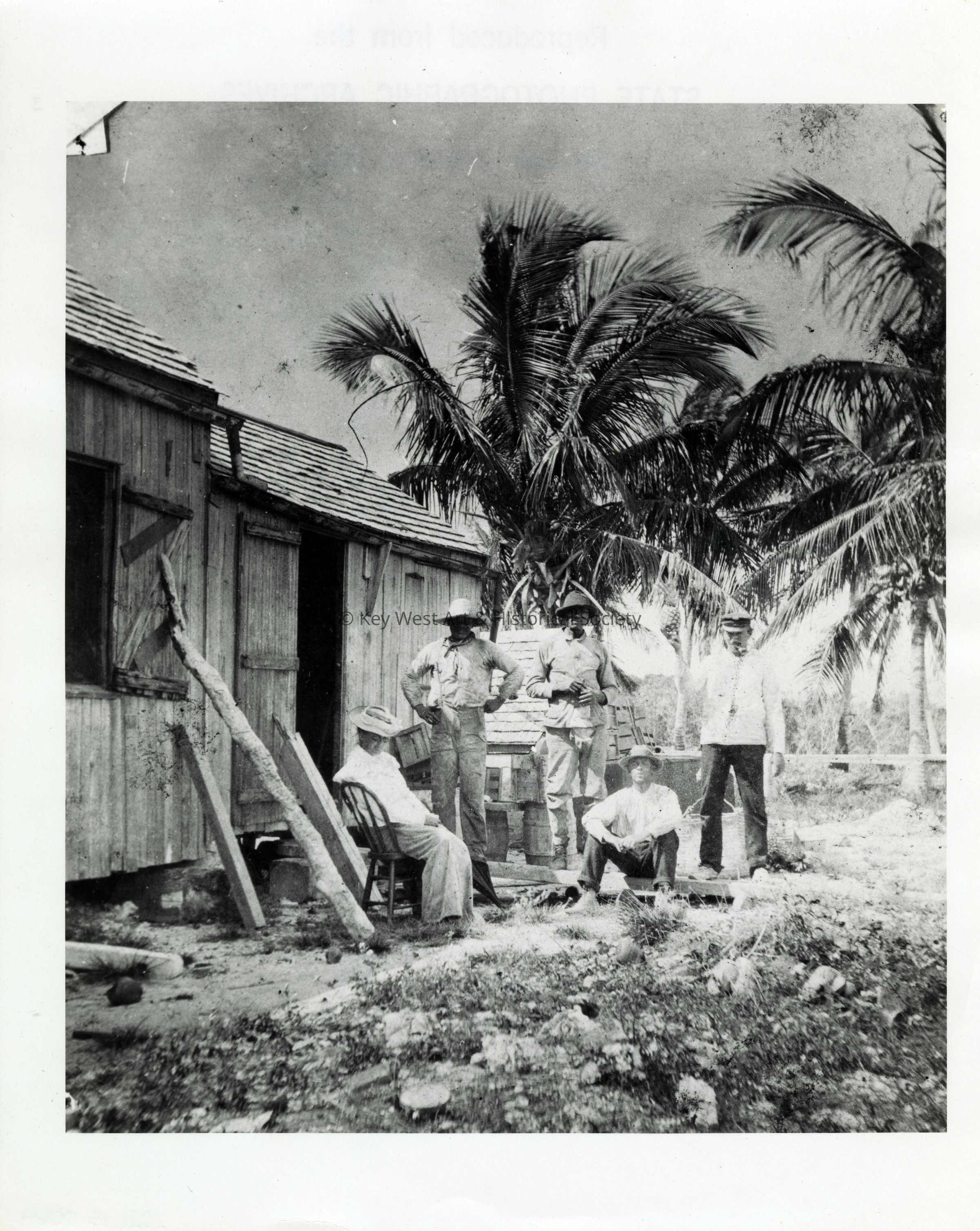 Black and white photograph of Florida East Coast Railway construction workers in front of a camp building, possibly at Pigeon Key.