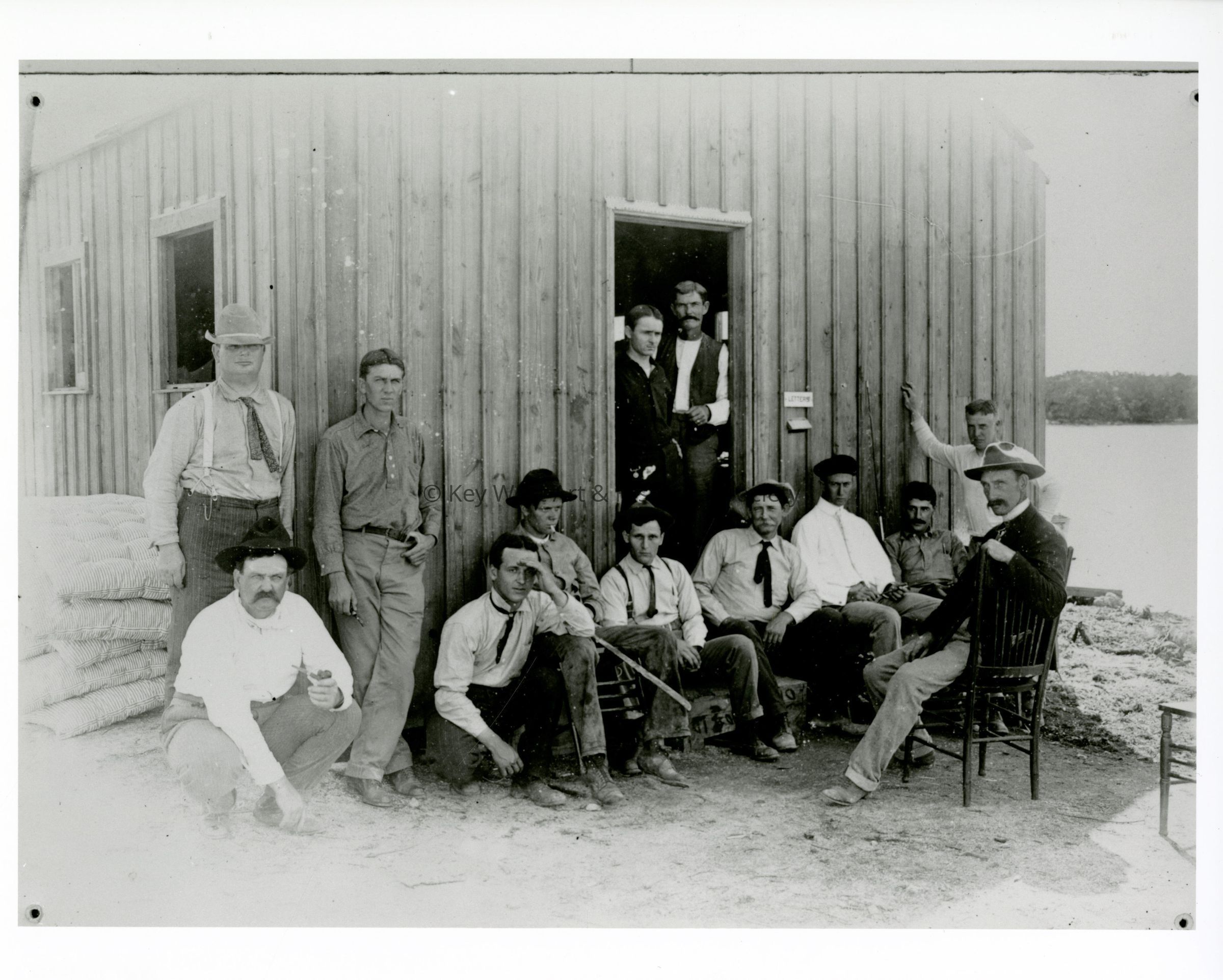 Black and white photograph of Florida East Coast Railway construction workers in front of a camp building, possibly at Pigeon Key.