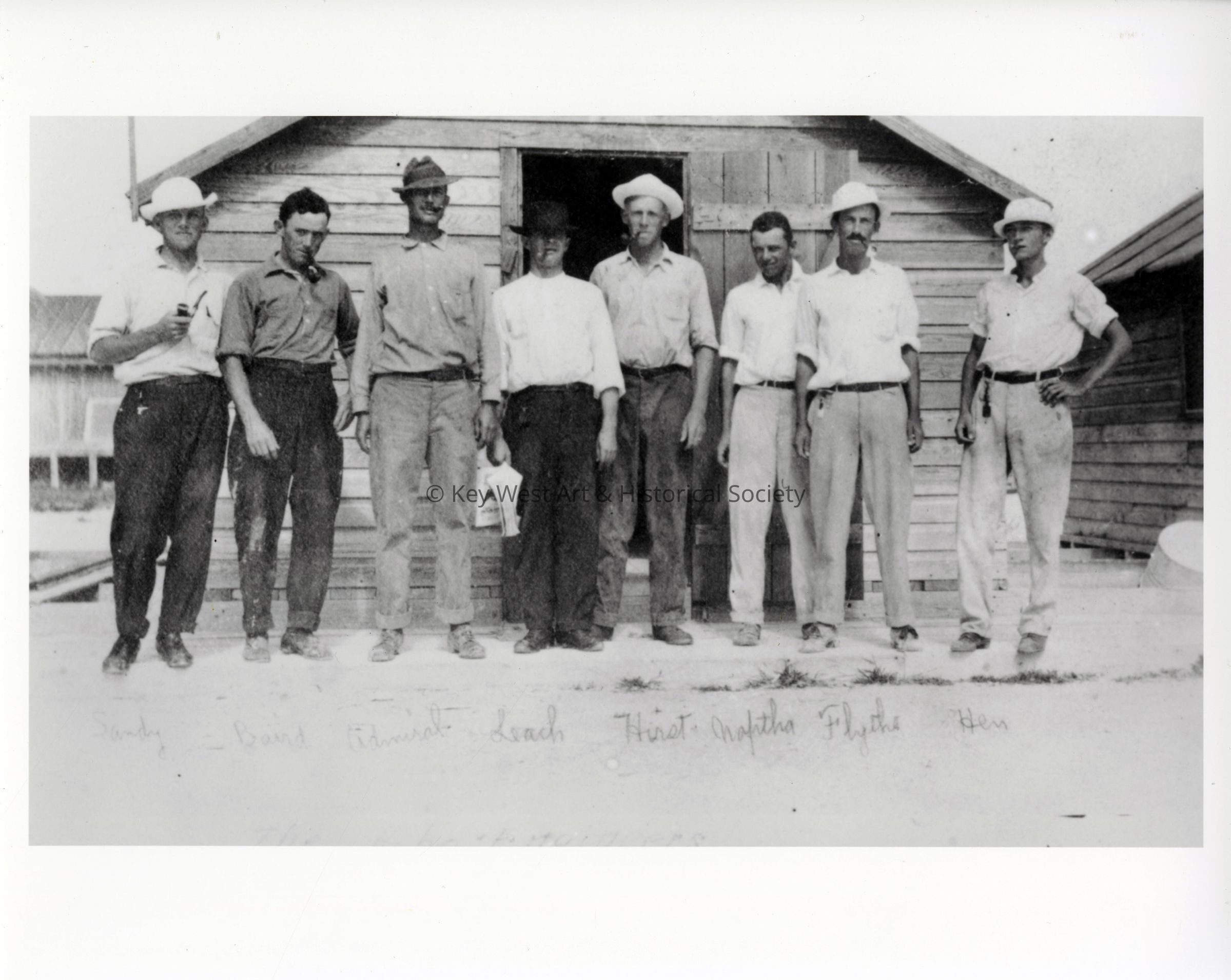 Black and white photograph of Florida East Coast Railway construction workers standing outside housing quarters at a construction camp.