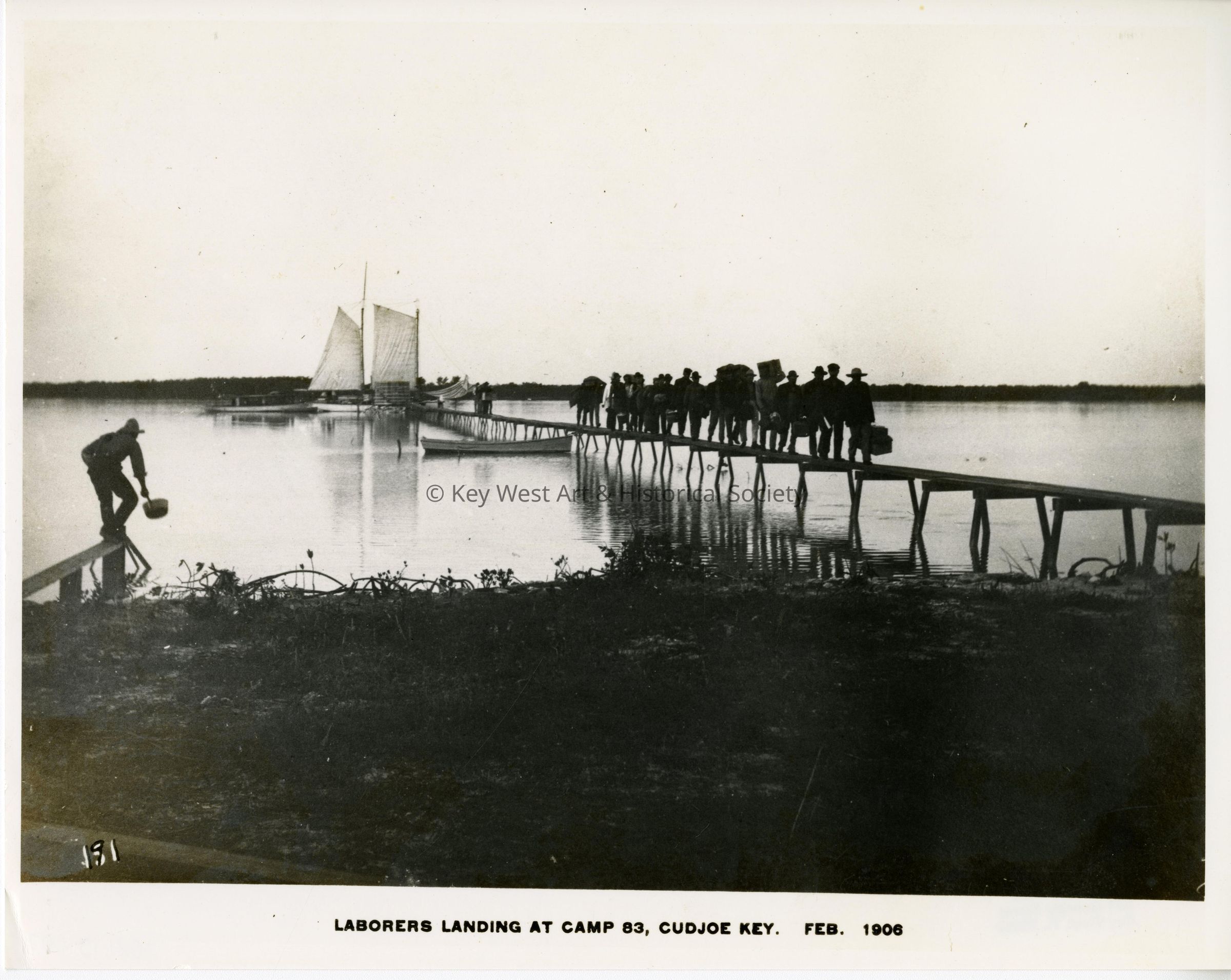 Black and white photograph of Florida East Coast Railway construction workers landing at Camp 83 on Cudjoe Key.