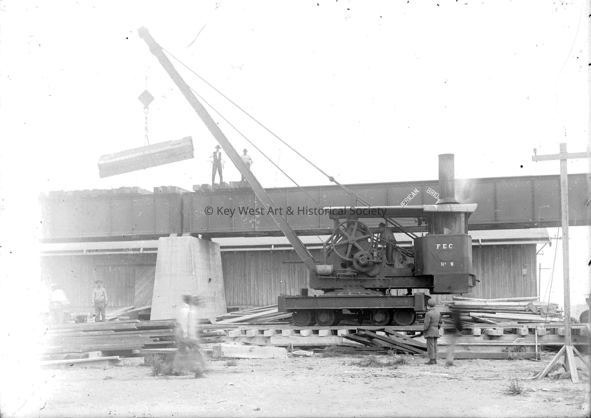 Black and white dry plate glass negative of a Florida East Coast Railway crane lifting ties onto the Seven Mile Bridge from Pigeon Key.