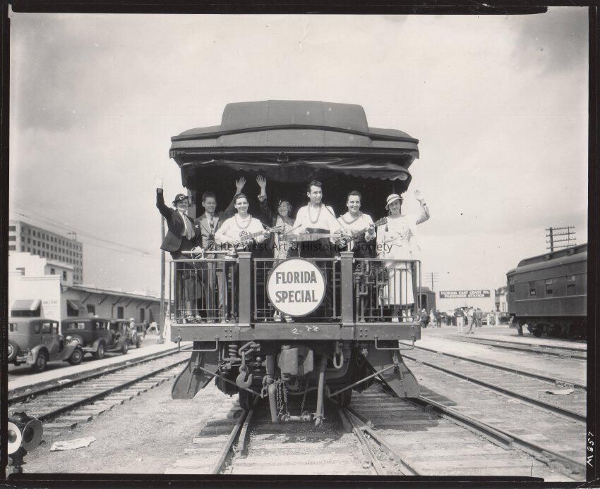 Black and white photograph of musicians and passengers at the rear of the Florida Special train at the Miami East Coast Railroad passenger station.Collection