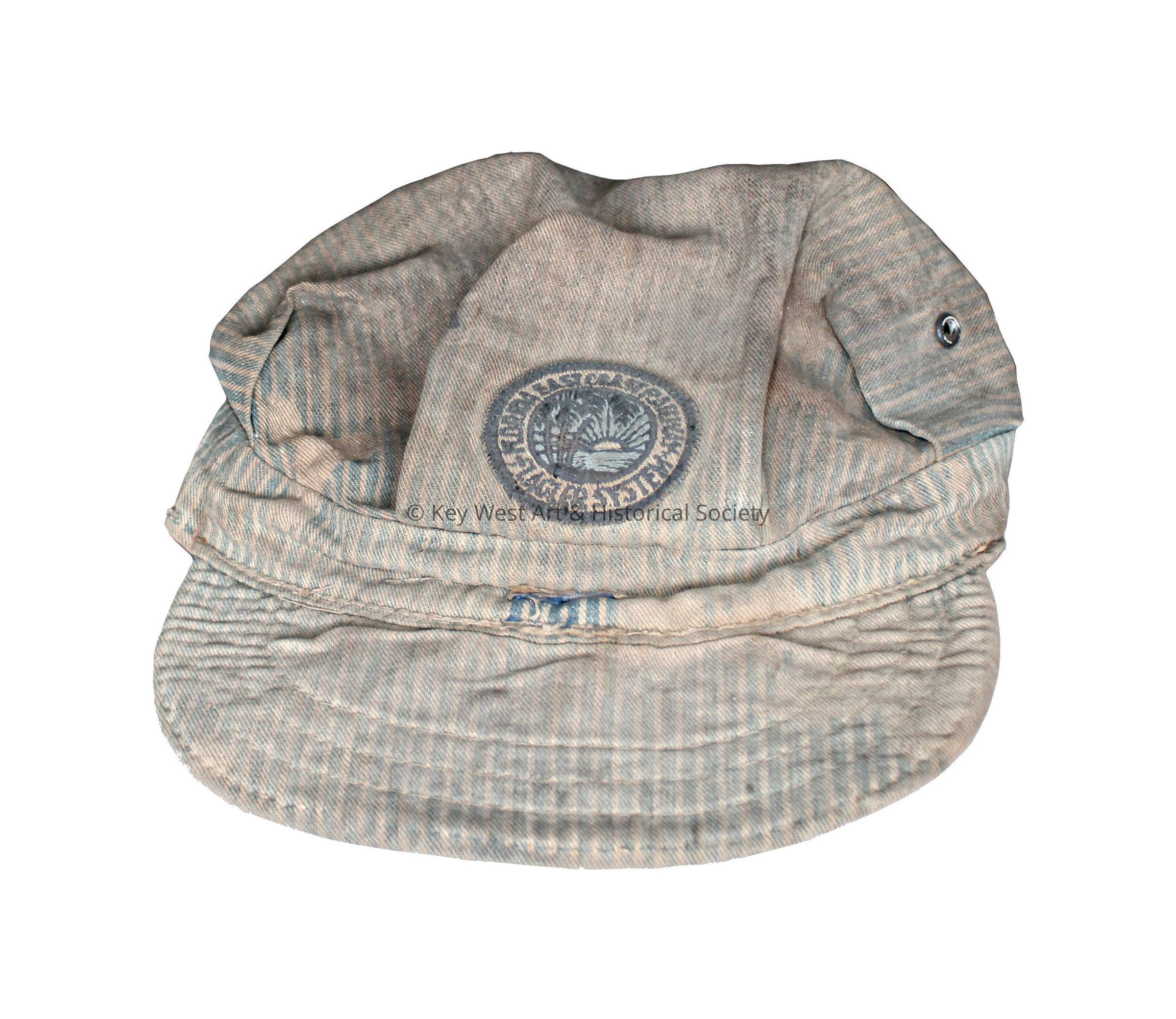 White and blue cotton brimmed and banded men's uniform hat with a Florida East Coast Railway patch.